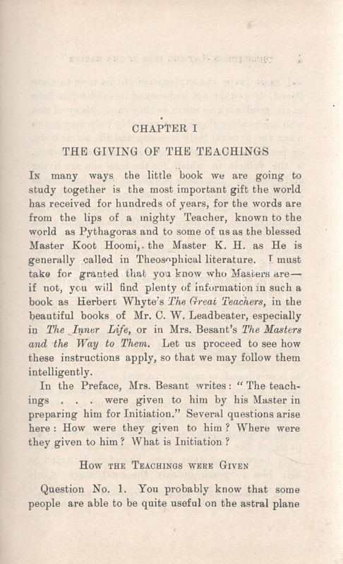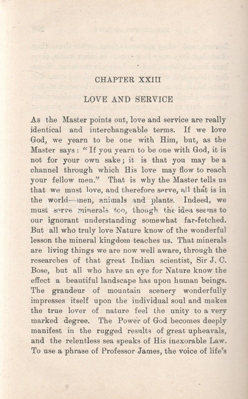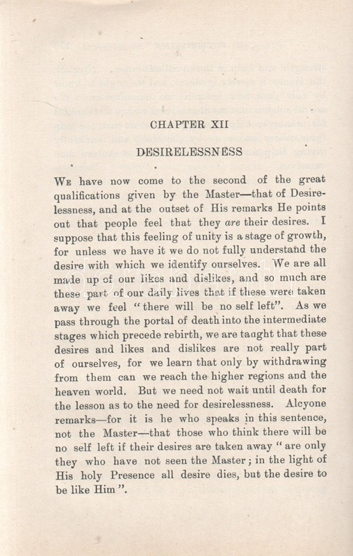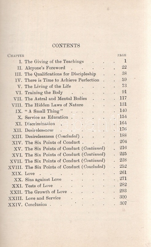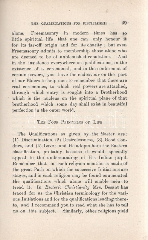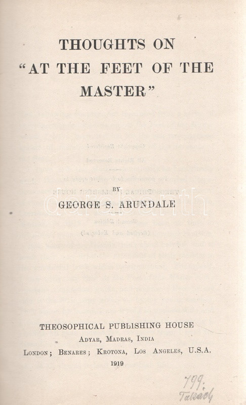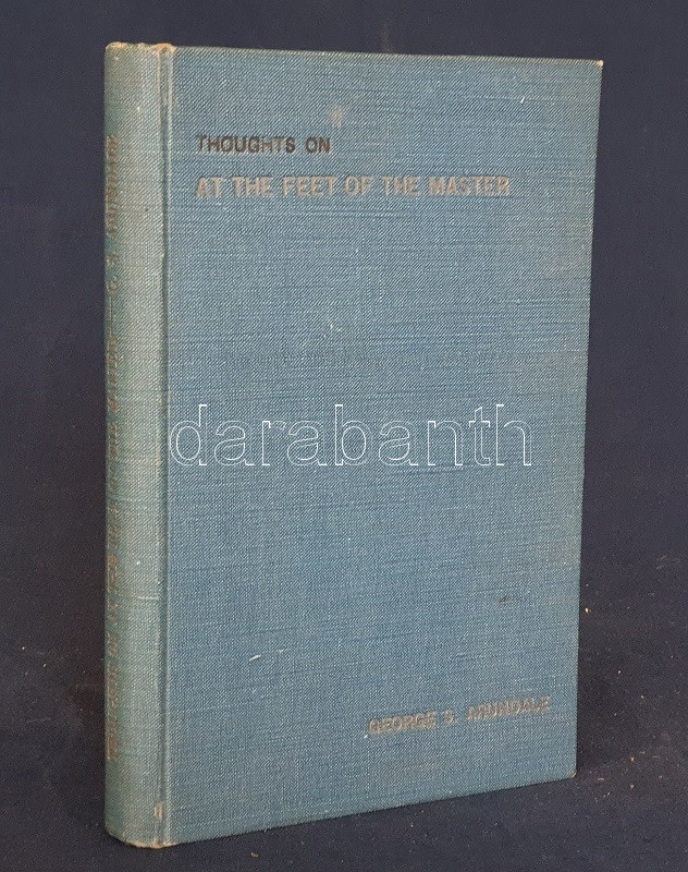 Arundale, George S[ydney]: Thoughts on ,,At the Feet of the Master". Adyar, 1919. Theosophical Publishing House (Printed by J. R. Aria at the Vasanta Press). VIII + [2] + 315 + [1] p. George Sydney Arundale (1878-1945) brit teozófus, szabadkőműves, indiai teozófus tanító, az adyari Teozófus Társaság elnöke. Kötetében 1914-1918 közötti előadásaiból szemezget. Jellemző fejezetcímek: A beavatottság feltétei. A test fegyelmezése. Az asztrális és mentális test. A természet rejtett törvényei. A szolgálat mint nevelés. Vágy nélkül élni. A szeretet próbái. Szeretet és szolgálat. A munka első kiadása 1918-ban jelent meg, példányunk a második, bővített kiadásból való. A címoldalon régi tulajdonosi bejegyzés és dátumozás. Poss.: Gyöngyöshalászy Takách Béla. [Gyöngyöshalászy Takách Béla (1874-1947) festő, építész, iparművész. A budapesti József Műegyetemen szerzett diplomája után Alpár Ignác mellett dolgozott Franciaországban, majd tíz évet töltött az Egyesült Államokban, ahol Alfons Mucha tanítványa volt. Kiállításai voltak New York, Boston, Philadelphia és Charleston városaiban. Az 1910-es években tért haza, itthon Széchenyi Bertalan, Dohnányi Ernő, Kozma Jenő villáit tervezte.] Aranyozott kiadói egészvászon kötésben. Jó példány.