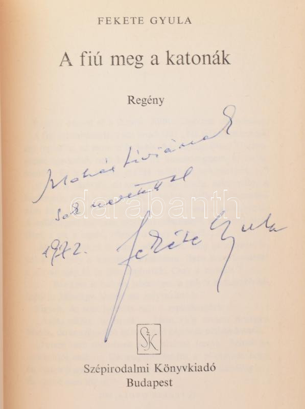 Fekete Gyula: A fiú meg a katonák. Regény. A szerző, Fekete Gyula (192... https://www.darabanth.com/en/469-Online-auction/469.0/Books/Books-Other-rarities~2000025/Fekete-Gyula-A-fiu-meg-a-katonak-Regeny-A-szerzo-Fekete-Gyula-1922-2010-haromszoros-Jozs~II3167743