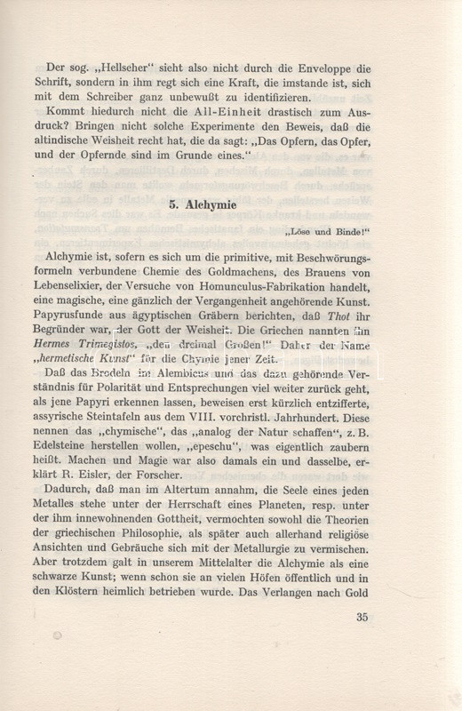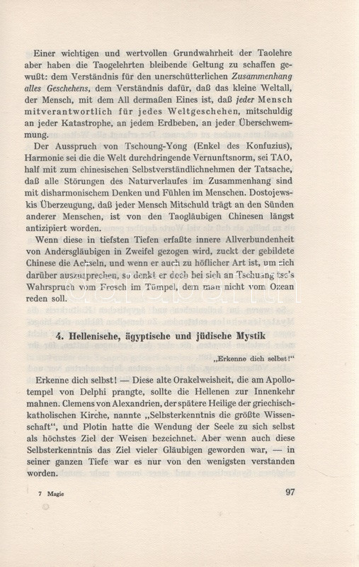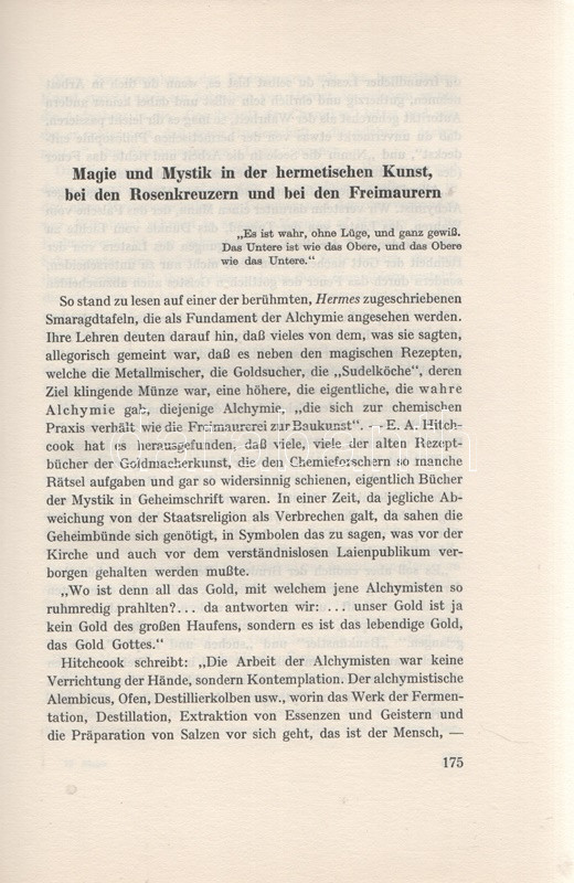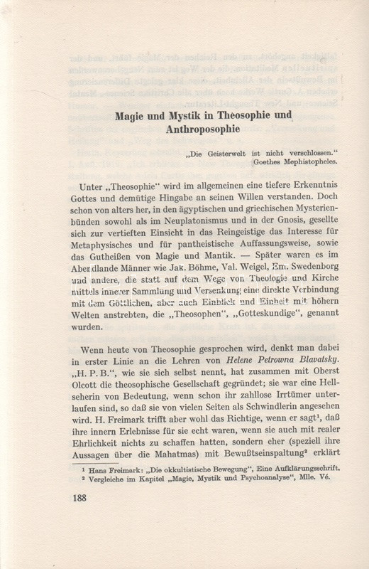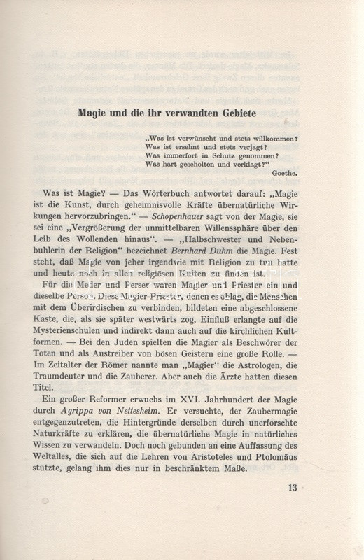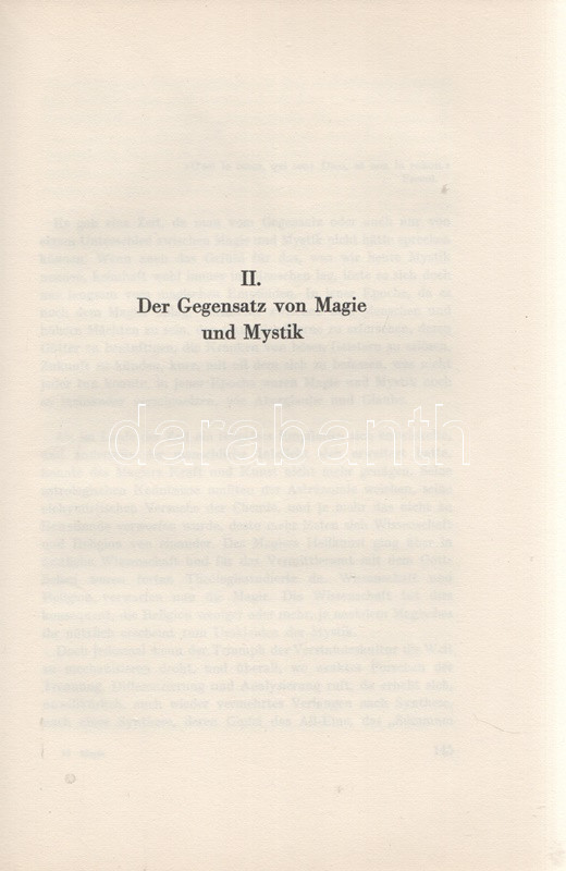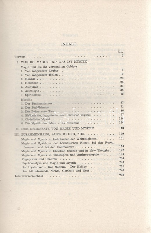 Ferger, N.: Magie und Mystik. Gegensatz und Zusammenhang. Zürich-Leipzig, (1935). Max Niehans Verlag. 252 p. Egyetlen kiadás. N. Ferger monográfiája külön-külön vizsgálja a klasszikus és kortárs okkult gyakorlatokat (klasszikus mágia, alkímia, asztrológia, spiritizmus), majd egyes tételes vallások rejtett oldalát vizsgálja (brahmanizmis, buddhizmus, taoizmus, hellén, egyiptomi, zsidó, keresztény és iszlám miszika), végül a mágia és a misztika kortárs határterületeinek tisztázását kísérli meg, a szabadművesség és a okkult, a teozófia és az okkult, a pszichoanalízis és az okkult kapcsolatait próbálja feltérképezni. A kötet végén részletes bibliográfia. Feliratozott kiadói egészvászon kötésben. Jó példány.