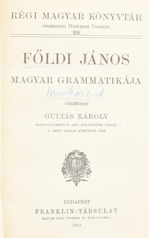 Description: Földi János, 2 mű egy kötetben: Földi János költeményei. Kiadta és bevezette: Dr. Mixich Lajos. + Földi János magyar grammatikája. Közzéteszi: Gulyás Károly. Régi Magyar Könyvtár 25. és 28. Bp., 1910-1912, Franklin-Társulat, 238+(2) p.; 303+(1) p. Átkötött félvászon-kötésben, jó állapotban, a borítón némi kopással.