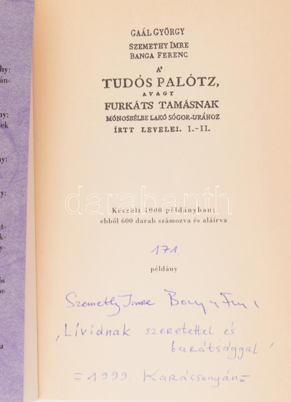 Számozott (171./600), az illusztrátorok, Banga Ferenc (1947- ) és Szemethy Imre (1945- ) grafikusok által aláírt példány. Alatta Mohás Lívia (1928-2024) pszichológus, József Attila-díjas írónak szóló dedikációval!