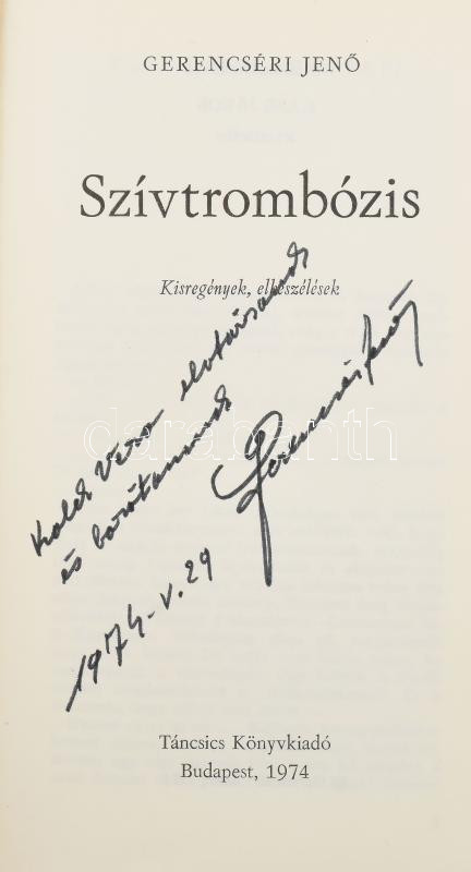 Gerencséri Jenő: Szívtrombózis. Kisregények, elbeszélések. Bp., 1974, Táncsics. A szerző, Gerencséri Jenő (1924-1994) újságíró, író, a Képes Újság főszerkesztője által Kolek Vera újságíró, a rádió riportere részére DEDIKÁLT! Kiadói egészvászonkötés, kiadói papírborítóval, borítón és címlapon kisebb szakadással.