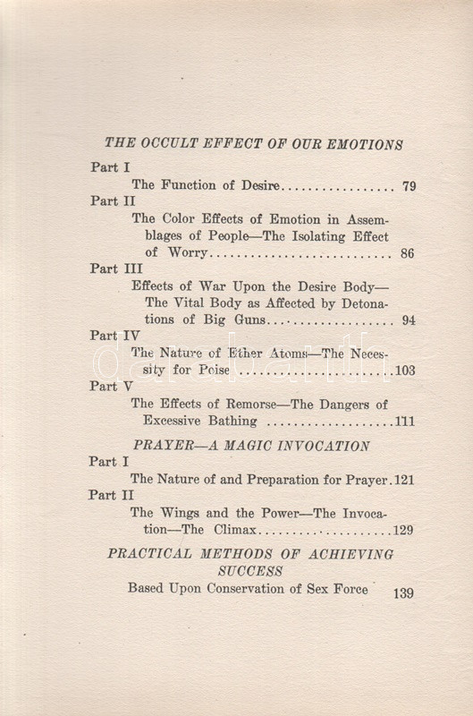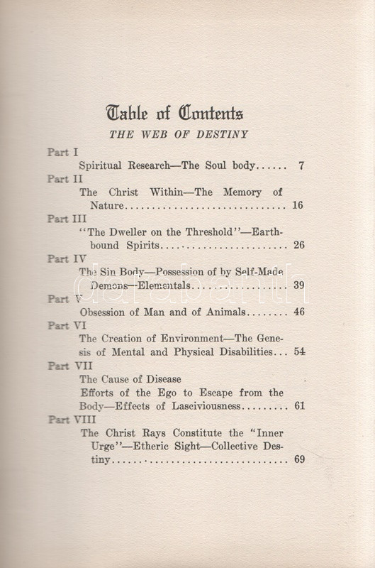 Heindel, Max: The Web of Destiny. How Made and Unmade. Also The Occult Effect of Our Emotions. Prayer - A Magic Invocation. Practical Methods of Achieving Success. A Series of Lessons Upon the Hidden Side of Life, Showing the Occult Forces Which Shape Our Destiny. Oceanside-London, 1920. Rosicrucian Fellowship - L. N. Fowler (Fellowship Press). 1 t. +. (címképen a szerző portréja) + 175 + [9] p. Max Heindel (1865-1919) dán származású amerikai okkultista, asztrológus, misztikus, üzletember, a mindmáig üzemelő amerikai Rózsakeresztes Testvériség (1909) megalapítója. Web of Destiny (,,Vágyak hálójában") című kötetében spirituális beavatottjai számára tartott tizenhét előadását teszi közkinccsé, többek között ilyen témákban: * Spiritual Research: The Soul body (Spirituális kutatás: a Lélektest) * The Christ Within: The Memory of Nature (A belső Krisztus: A természet emlékezete) * The Dweller on the Threshold: Earth-bound Spirits (A Küszöbön Lakozók avagy a Földhöz kötött Szellemek) * The Sin Body: Possession of by Self-Made Demons-Elementals (A Bűntest: A magunk kreálta démonok igájában) - The Cause of Disease: Efforts of the Ego to Escape from the Body : Effects of Lasciviousness (A Betegség Oka: Az Ego menekülése a Testtől avagy A Bujaság következményei) * Practical Methods of Achieving Success: Based Upon Conservation of Sex Force (A Sikerhez vezető út: Tartózkodni a nemi erő tékozlásától). A szerző az alábbi témák mellett óva int a túlzásba vitt fürdőkúráktól is, amely indokolatlan vágyakozást ébreszt. A címekből is látható, hogy a Rózsakeresztes Testvériség alapítója, tanítója, házi szerzője és tulajdonosa szemmel láthatólag elmarasztalta az aszkézis és szemlélődés útjáról letérítő életörömöt. A kötet végén a kiadó kapcsolódó termékeinek hirdetése. Az első előzéken régi könyvkereskedői könyvjegy és tulajdonosi bejegyzés, a címoldalon régi dátumbejegyzés, néhány oldalon aláhúzások. Poss.: Gyöngyöshalászy Takách Béla. [Gyöngyöshalászy Takách Béla (1874-1947) festő, építész, iparművész. A budapesti József Műegyetemen szerzett diplomája után Alpár Ignác mellett dolgozott Franciaországban, majd tíz évet töltött az Egyesült Államokban, ahol Alfons Mucha tanítványa volt. Kiállításai voltak New York, Boston, Philadelphia és Charleston városaiban. Az 1910-es években tért haza, itthon Széchenyi Bertalan, Dohnányi Ernő, Kozma Jenő villáit tervezte.] Aranyozott, festett, a Rózsakeresztes Testvériség szimbólumával illusztrált kiadói egészvászon kötésben. Szép példány.