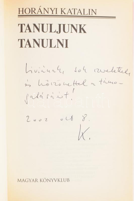 Description: Horányi Katalin: Tanuljunk tanulni. A szerző, Horányi Katalin (1947-) által Mohás Lívia (1928-2024) pszichológus, József Attila-díjas író részére DEDIKÁLT példány. Bp., 2002, Magyar Könyvklub. Kiadói kartonált papírkötés.