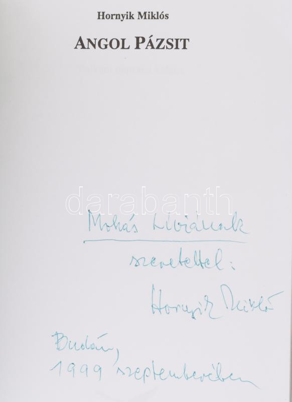Hornyik Miklós: Angol pázsit. Bálkáni néprajzi kalauz. A szerző, Hornyik Miklós (1944 - 2012) író, újságíró, kritikus, szerkesztő által Mohás Lívia (1928-2024) pszichológus, József Attila-díjas írónak DEDIKÁLT példány. Bp., 1996, Kortárs. Kiadói papírkötés.