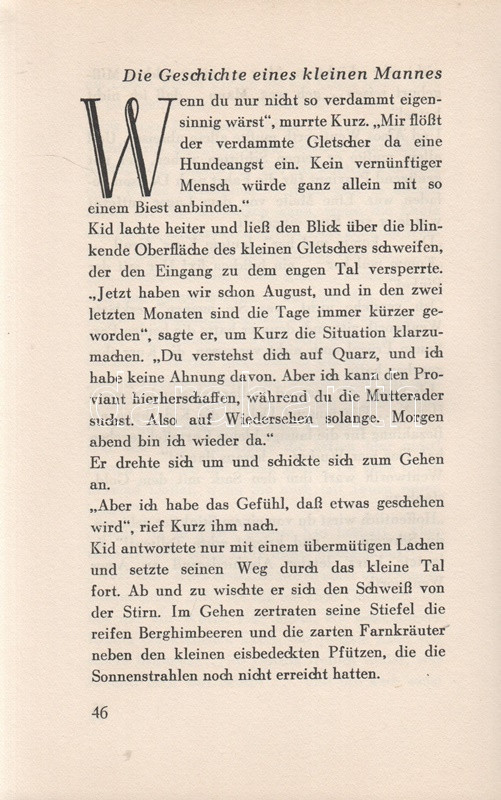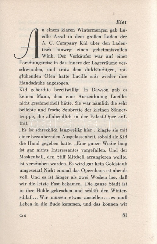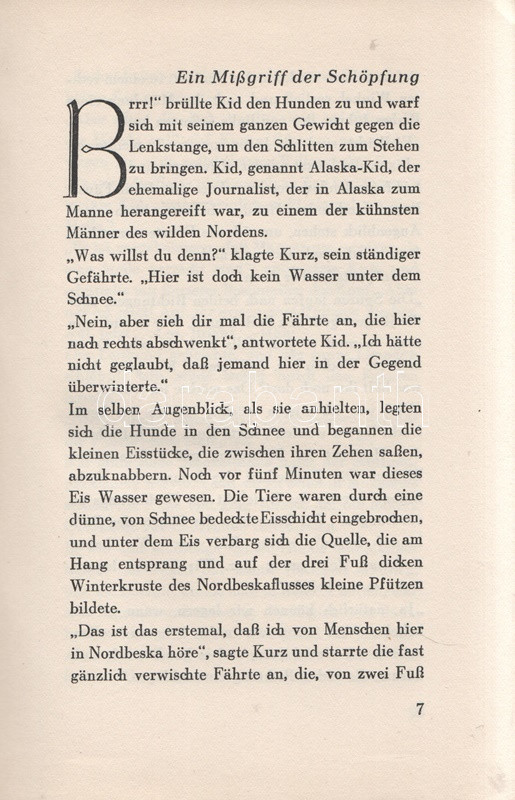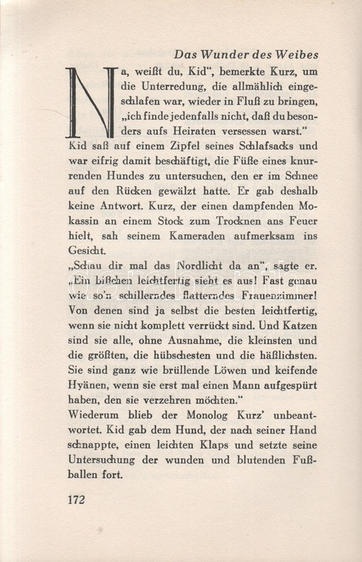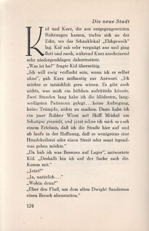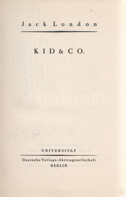 Jack London: Kid & Co. Einzig berechtigte Übersetzung von Erwin Magnus. [Elbeszélések.] Berlin, (1931). Universitas Deutsche Verlags-Aktiengesellschaft (Gedruckt in der Buchdruckwerkstätte GmbH.) 282 + [6] p. Első német kiadás. Jack London (1876-1916) amerikai író novellatermése nagyrészt három-négy téma körül csoportosul: alaszkai történetekre, kaliforniai csavargótörténetekre, délszaki történetekre, illetve tudományos-fantasztikus elbeszélésekre osztható. Elbeszéléskötetünk az eredeti nyelven 1912-ben kiadott ,,Smoke Bellew" című vadnyugati-alaszkai kötet anyagából válogat; a tematikusan enyhén összefüggő határvidéki novellákból 1929-ben némafilm is készült. A címlap verzóján régi tulajdonosi bejegyzés. (Das gesamte Werk Jack Londons.) Aranyozott kiadói egészvászon kötésben, felül színes festésű lapszélekkel, színes, illusztrált kiadói védőborítóban. Jó példány.