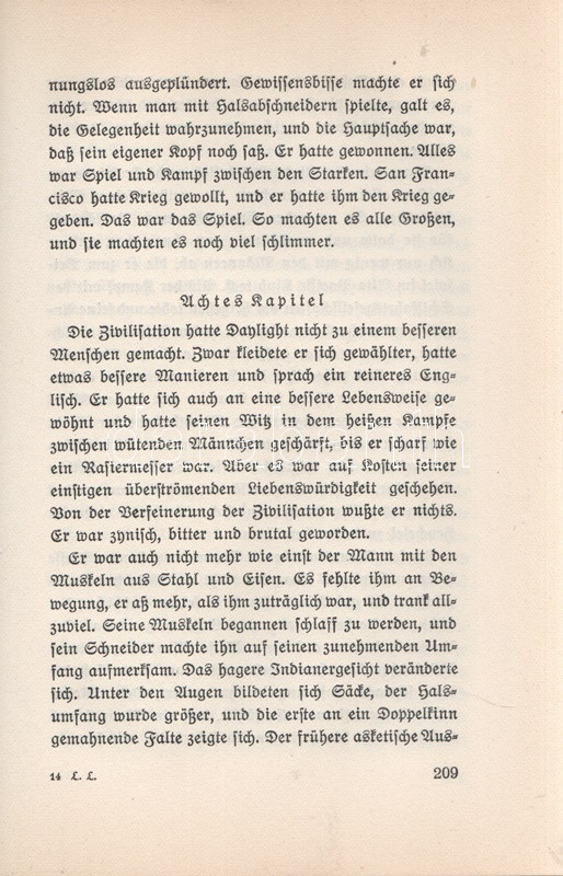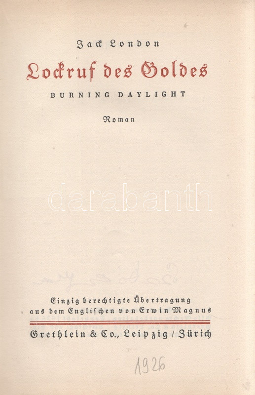 Jack London: Lockruf des Goldes. Einzig berechtigte Übertragung von Erwin Magnus. [Regény.] Leipzig-Zürich, (1926). Gretglein & Co. 372 + [2] p. Első német kiadás. Jack London (1876-1916) amerikai író, aranyásó, tengerész, újságíró, szociális mozgalmár, állatvédő, az önmaga erejéből befolyásos íróvá és közhírességgé lett egyszerű állampolgár amerikai példája. Kalandos élete során személyesen tapasztalta meg az 1897-1898. évi alaszkai határvidéken, Klondike-ban és környékén lezajlott aranylázat, melyről több művet is írt. Az eredeti nyelven 1910-ben ,,Burning Daylight" címmel megjelent regénye a szociológiai esettanulmánynak is beillő kalandor vállalkozás témáját dolgozta fel. A címlap verzóján régi tulajdonosi bejegyzés, az első előzéken kereskedői könyvjegy. Georg Baus grafikusművész által tervezett, színes kiadói kartonkötésben és színes, illusztrált, enyhén sérült kiadói védőborítóban, felül színes festésű lapszélekkel. Jó példány.