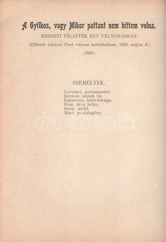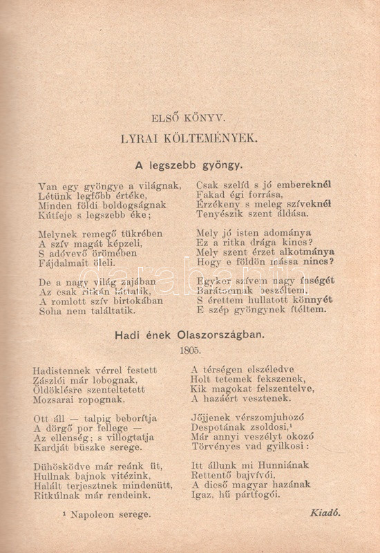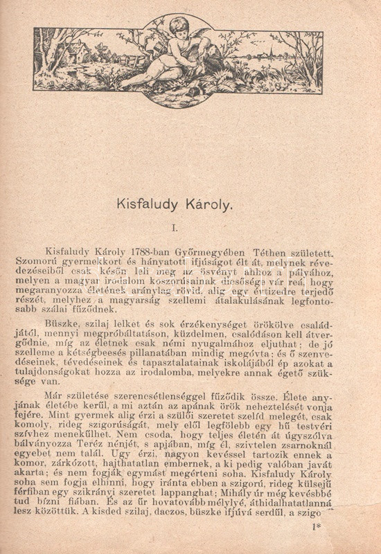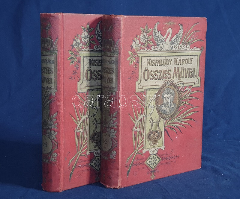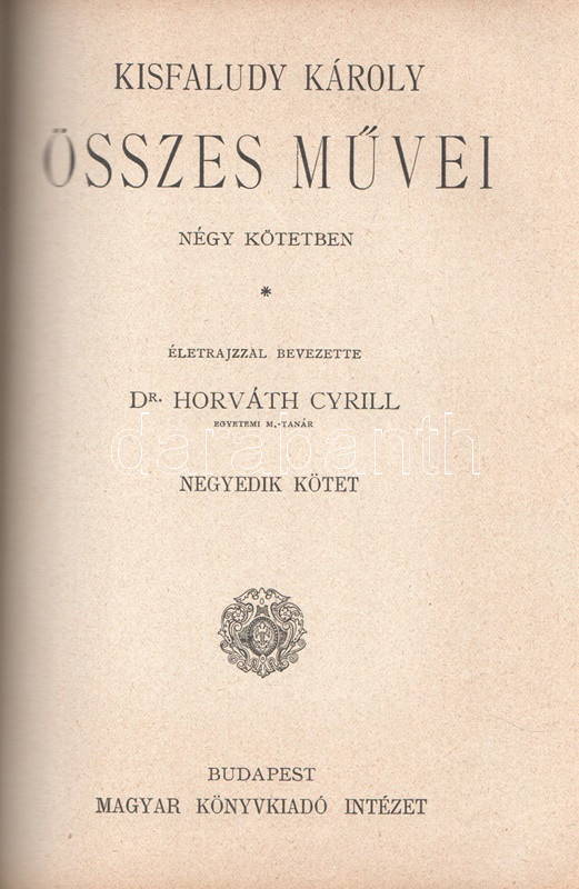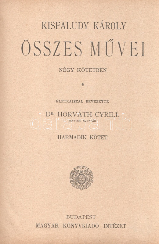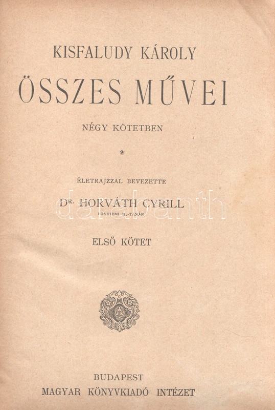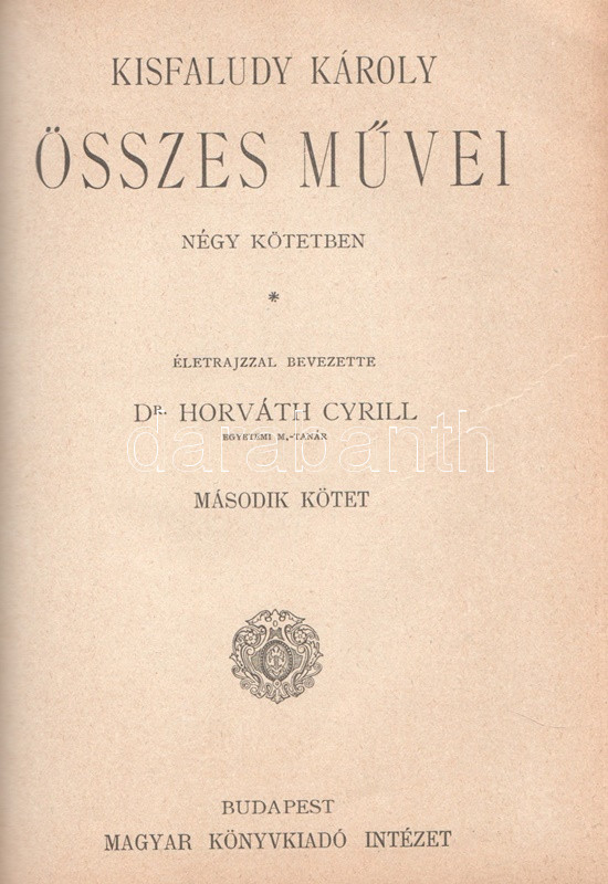 Kisfaludy Károly: Kisfaludy Károly összes művei négy kötetben. Életrajzzal bevezette Horváth Cyrill. Első-negyedik kötet. [Teljes mű két kötetbe kötve.] Budapest, [1899]. Magyar Könyvkiadó Intézet (Gönczi József ny., Szeged). 668 + IV p.; 674 + II p. A négykötetes mű törzsanyaga Kisfaludy Károly drámaírói életművét közli, a drámatöredékeket és drámafordítását is beleértve. A drámák előtt Kisfaludy költői termése, utána prózaírói és értekező munkássága, végül (részben német nyelvű) levelezése. A második kötet egy levelén kisebb szakadás. Egységes, aranyozott, festett, vaknyomásos kiadói egészvászon kötésben, az első kötet gerincén alul apró hiánnyal, márványmintás festésű lapszélekkel. Jó példány.