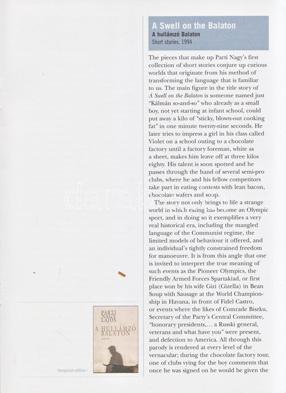 Dedikált: ,,Németh Andornak: Parti Nagy Lajos. 2011. 06. 02". Parti Nagy Lajos rövid pályaképét és három regényének méltatását Németh Zoltán írta, a szöveget T. Wilkinson fordította angolra. Oldalszámozáson belül néhány színes illusztrációval, a belső borítókon a szerző idegen nyelvű kiadásainak adataival.