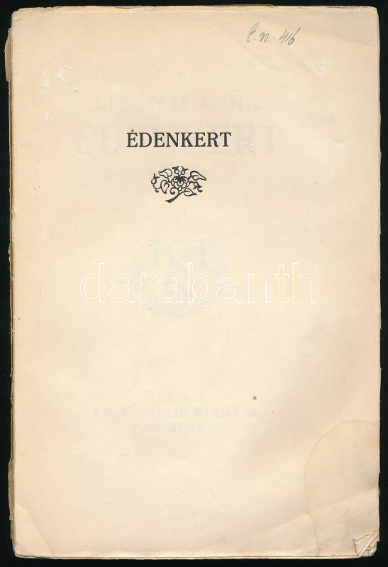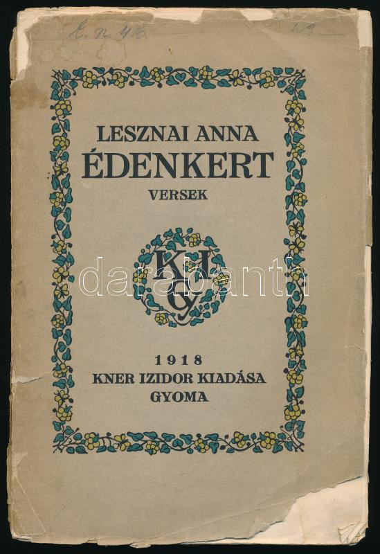 Lesznai Anna: Édenkert. Versek. A szerző rajzaival. Gyoma, 1918, Kner Izidor, 166+(10) p. Első kiadás. Kiadói papírkötés, a borító és a gerinc sérült, az elülső borító különvált a könyvtesttől, a könyv elején több, a fűzéstől elváló lappal, kisebb ázásnyomokkal.