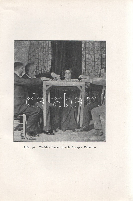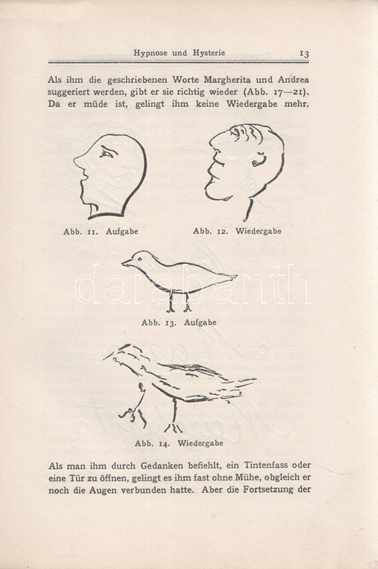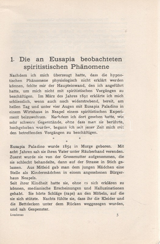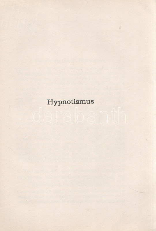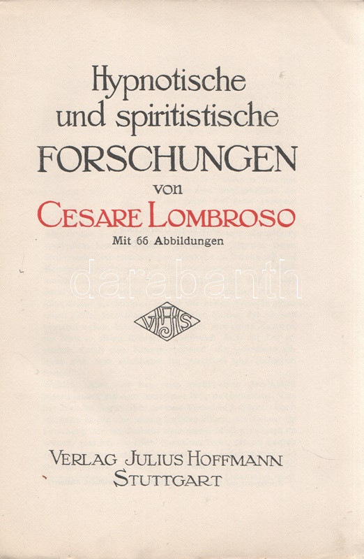 Lombroso, Cesare: Hypnotische und spiritistische Forschungen. Mit 66 Abbildungen. Berechtigte Übersatz von Carl Grundig. Stuttgart, (1909). Verlag Julius Hoffmann. 1 t. (színes címkép) + XVI + 384 + [8] p. + 23 t. Első német kiadás. Cesare Lombroso (1835-1909) olasz kriminológus, korai antropológus, a test felépítése és a bűnözői hajlam között megfeleléseket kereső bűnügyi szakértő, a bűnözés öröklődő jellege mellett érvelő, ellentmondásos megítélésű elméletíró a századforduló környékétől elmélyült a spiritiszta tanokban is. A hipnotizmusról, médiumizmusról, szellemidézésről és materializálódásról írt műve számos esettanulmányt idéz, valamint némi kultúrtörténeti keretben tárgyalja a világ számos vidékének mágikus hagyományait. A munka első, hipnózisról fejezetében oldalszámozáson belül számos szövegközti ábra kíséri. Az első nyomtatott oldalon sorszámozás, sorszáma: 00586. Példányunk fűzése meglazult. Ackermann II, 261. Langen 1747, I. Fűzve, feliratozott, sérült kiadói borítóban.