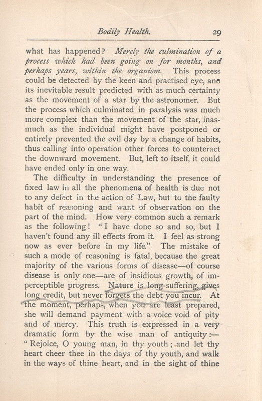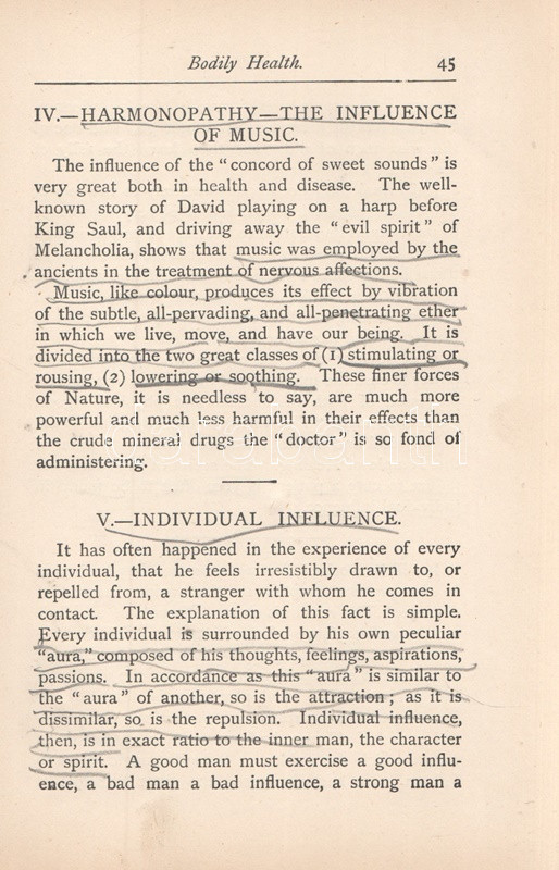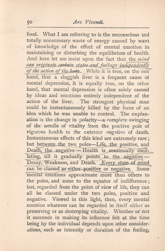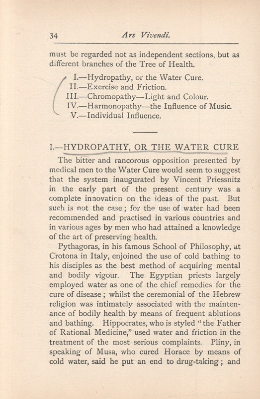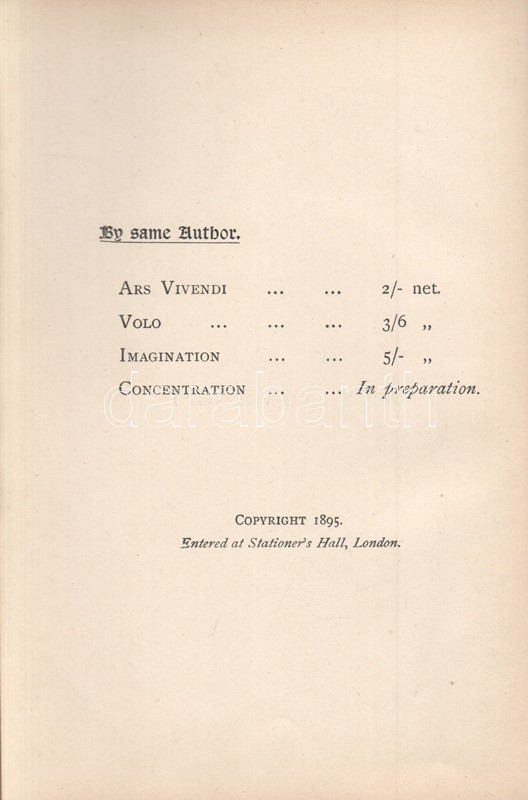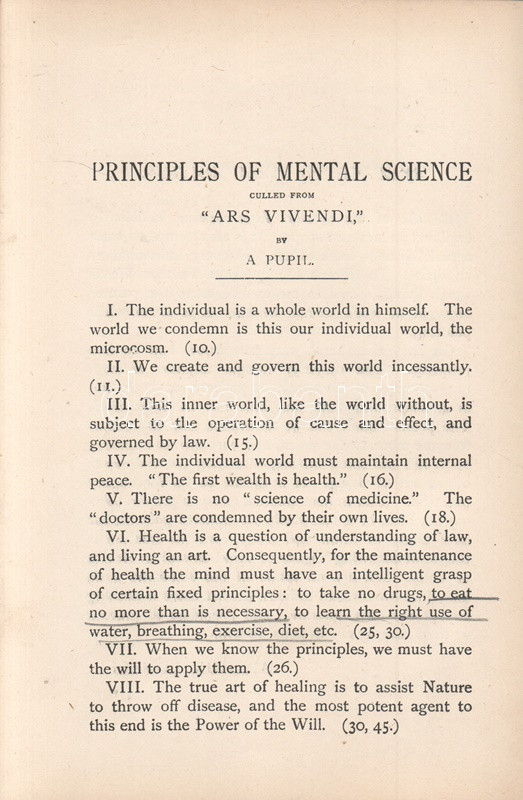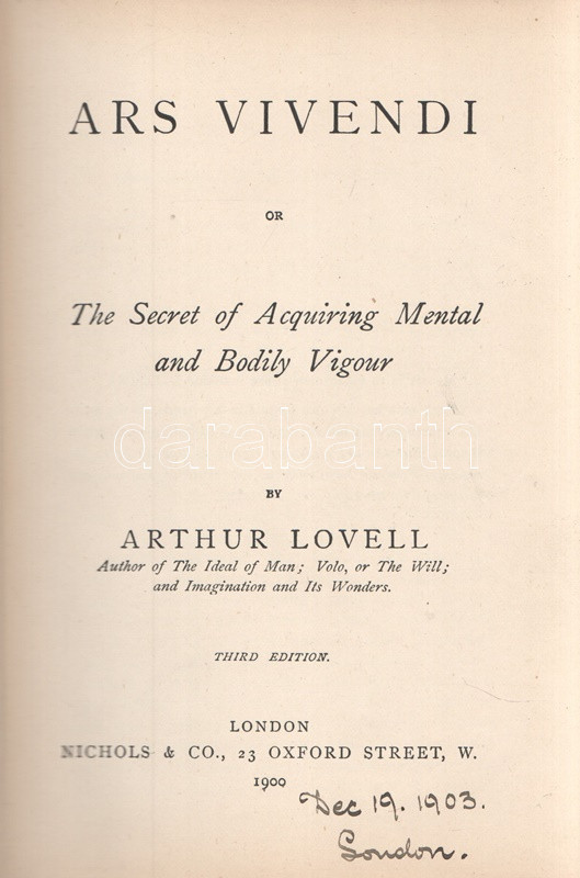 Lovell, Arthur: Ars Vivendi, or The Secret of Acquiring Mental and Bodily Vigour. Third Edition. London, 1900. Nichols and Company (Printed by Robert Stockwell). 93 + [5] p. Arthur Lovell természetgyógyász és ezoterikus szerző értekezése a testi-lelki jólét elnyerésének módszereiről. A korabeli természettudományos kísérletezést a lélektan új területeire áthelyező szerző a hidroterápia rendkívül népszerű módszereinek kivonatos ismertetése után az érzelmek szerepét kutatja a lelki egészség egészében. A munka első kiadása 1895-ben jelent meg, példányunk a harmadik kiadásból való. A címoldalon a tulajdonostól, Gyöngyöshalászy Takách Béla (1874-1947) festő, építész, iparművésztől származó korabeli dátumozás, néhány oldalon aláhúzások. Aranyozott, vaknyomásos kiadói egészvászon kötésben. Jó példány.