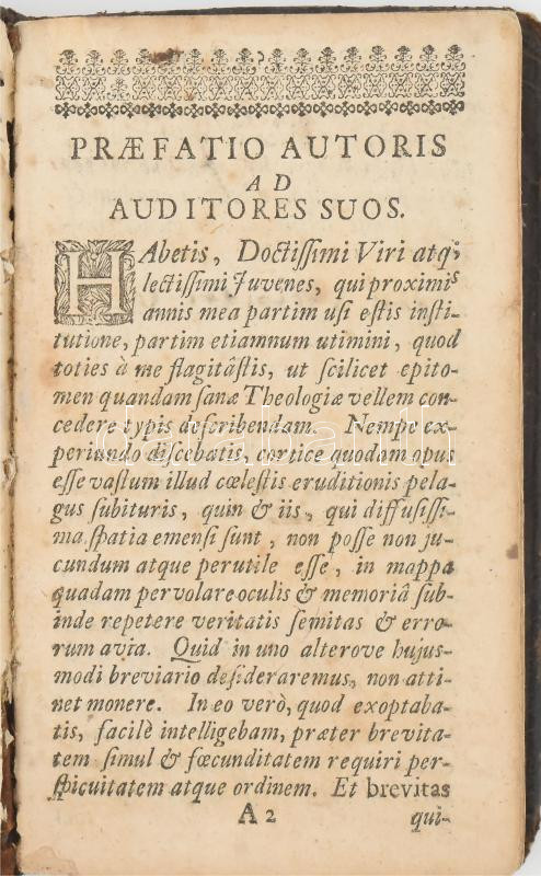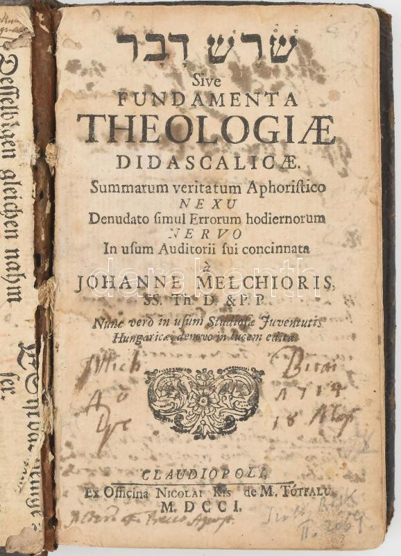 [Melchior, Johan (1646-1689)] Johannes Melchioris: Sóres Dávár Sive Fundamenta Theologiae Didascalicae. Summarum veritatum aphocristico nexu, denudato simul errorum hodiernorum nervo, in usum auditorii sui concinnata a Johanne Melchioris, SS. Th. D. & P.P. nunc vero in usum studiosa juventutis Hungaricae, denovo in lucem edita. Claudiopolis [Kolozsvár], 1701, Ex Officina Nicolai Kis de M. Tótfalu [Misztótfalusi Kis Miklós], 8 sztl. lev.+268 p.+2 sztl. lev. Latin nyelven. Korabeli egészbőr-kötés, kopott borítóval, sérült gerinccel, a könyvtest részben elvált a borítótól, hiányzó szennylapokkal, a címlapon és az utolsó két lapon, valamint a kötéstáblák belsején bejegyzésekkel, az utolsó lap foltos, benne további kissé foltos lappal. Ritka! RMK II. 2064.
