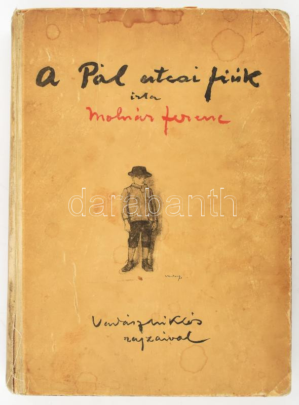 Molnár Ferenc: A Pál-utcai fiúk. Regény kis diákok számára. Vadász Miklós rajzaival. Bp., 1912., Franklin, 231 p.+18 t. Kiadói félvászon-kötésben, kopott, foltos borítóval, sérült gerinccel, kijáró lapokkal és táblákkal, néhány lapon és táblán sérüléssel, szakadással, egy tábla szélén hiánnyal, hiányzó elülső szennylappal és megerősített kötéssel, megviselt állapotban.