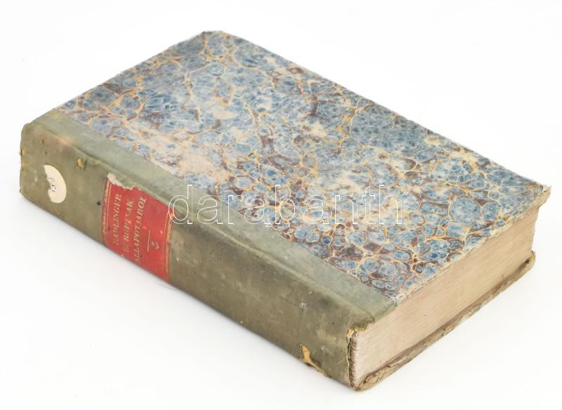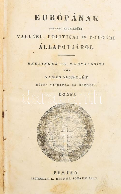 Rädlinger, [Johann]: Európának mostani megrendült vallási, politicai és polgári állapotjáról. Rädlinger után magyarosítá egy nemes nemzetét híven tisztelő és szerető Honfi. Pesten, [1837.], Esztergami K. Beimel József árúja, XXVIII+595 p. Első kiadás. Fordítója valószínűleg Perlaky Mihály (1814-89) piarista bölcsészdoktor, hivatalnok, esztéta, tanár, szerkesztő, író, borkereskedő, akit izgatásért várfogságra is ítéltek 1849-ben. Korabeli félvászon-kötés, kopott borítóval, kissé sérült gerinccel, az 550-595 között foltos lapélekkel, de alapvetően belül jó állapotban.