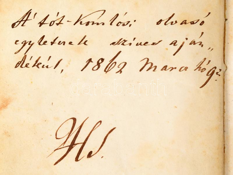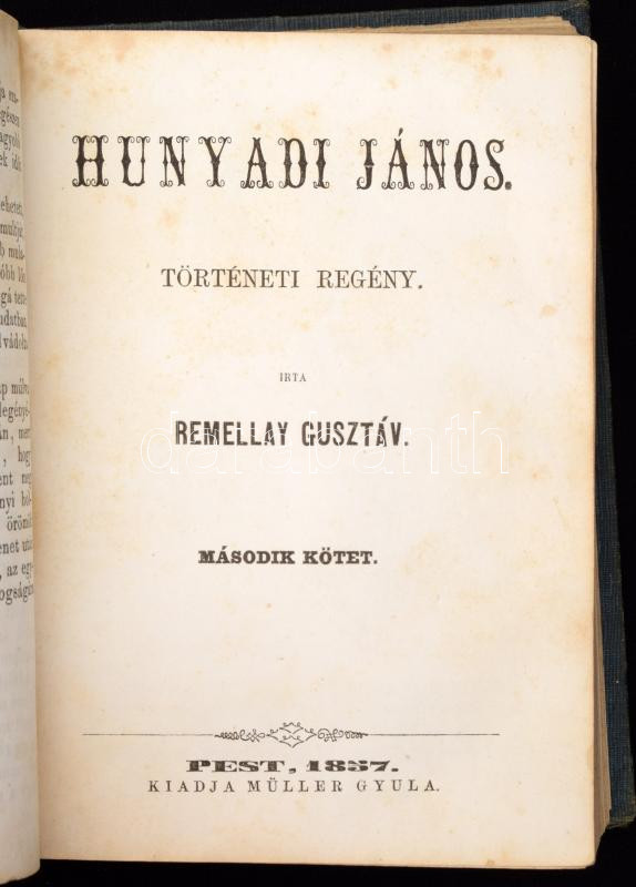 Remellay Gusztáv: Hunyadi János I-II. köt. [Egybekötve.] Pest, 1857, Müller Gyula, 2+III+1+7-148 p. + 221+2 p. Korabeli egészvászon-kötés, kopott borítóval, sérült, javított gerinccel, foxing foltos lapokkal, (?egy lap hiánnyal az első részben (5/6?), 1862-es ajándékozási sorokkal: "A tót-komlósi olvasó egyletnek szíves ajándékúl, 1862 marcz ... H.J."