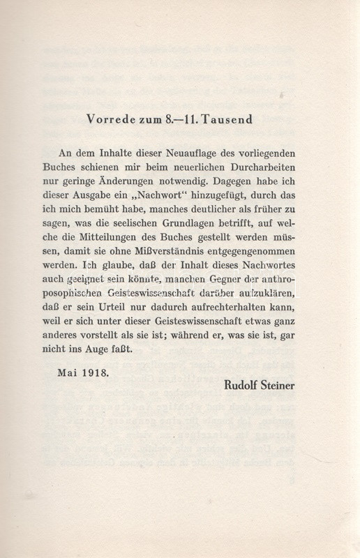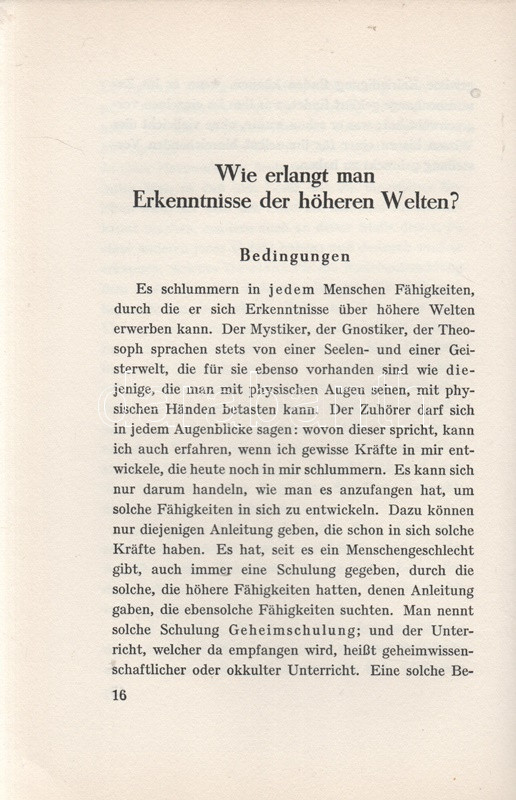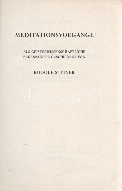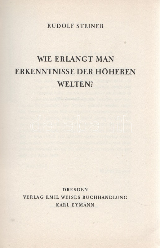 Steiner, Rudolf: Wie erlangt man Erkenntnisse der höheren Welten? [Drezda] Dresden, (1939). Verlag Emil Weises Buchhandlung - Karl Eymann (Druck der Spamer AG., Leipzig). 241 + [7] p. Rudolf Steiner (1861-1925) osztrák polihisztor, pedagógus, teozófus, antropozófus, az antropozófia nevű irányzat alapítója. ,,Wie erlangt man Erkenntnisse der höheren Welten?" (A magasabb világok megismerésének útja) című művének első kiadása még teozófiai korszakában született, 1905-ben, a teozófiával való 1912-es végleges szakítása előtt. Az érzékelhető világon túli szellemi világ megismerésének ezoterikus útját körbeíró kötet újabb kiadásaihoz újabb és újabb előszavakat illesztett, a legutolsót az 1918-ban megjelenő új lenyomathoz. Rudolf Steiner alapozó munkájának magyar kiadása először 1941-ben jelent meg. A hátsó előzéken az egykori tulajdonos német nyelvű jegyzetei, illetve olvasási élménye nyomán keletkező magyar nyelvű verses meditációja. Aranyozott kiadói egészvászon kötésben. Jó példány.