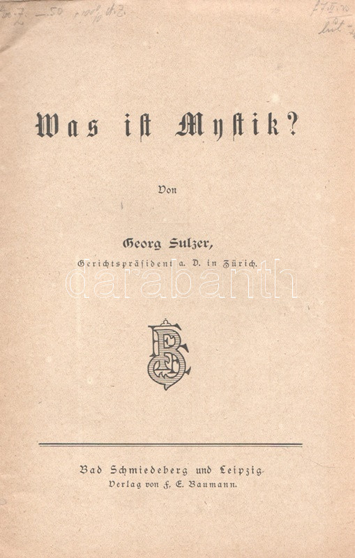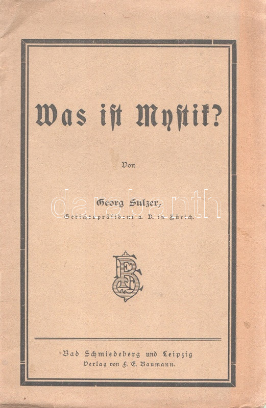 Bad Schmiedeberg-Leipzig, [1919]. Ver... https://www.darabanth.com/en/469-Online-auction/469.0/Books/Books-Other-rarities~2000025/Sulzer-Georg-Was-ist-Mystik-Bad-Schmiedeberg-Leipzig-1919-Verlag-und-Druck-von-F-E-Bauman~II3172518