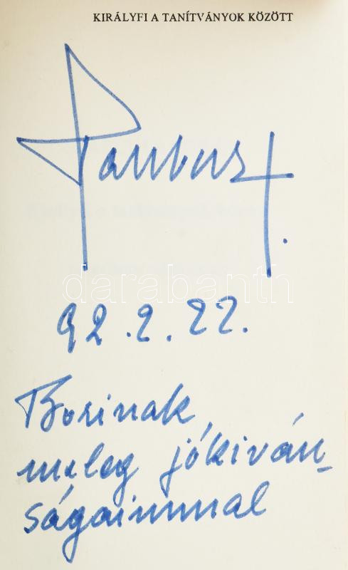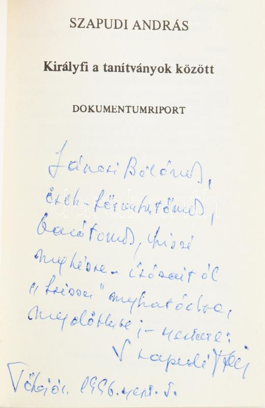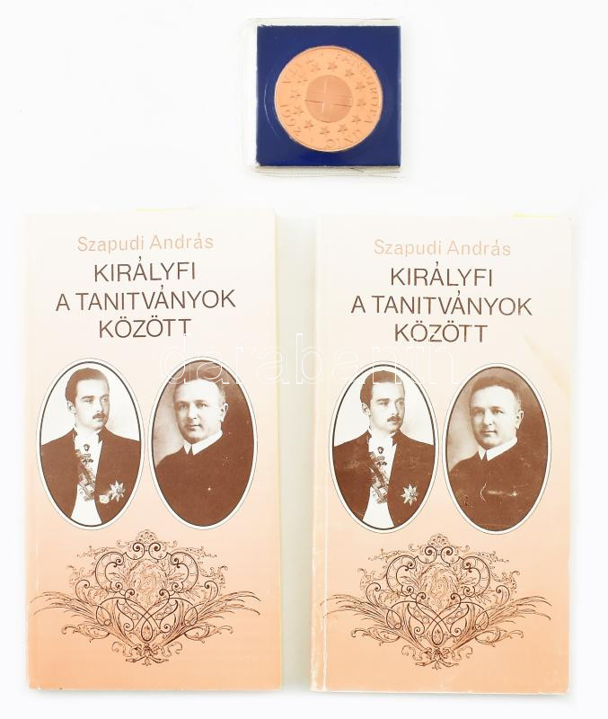 Szapudi András: Királyfi a tanítványok között. Dokumentumriport. Veszprém, 1990, (Prospektus GM-ny.), 95 p. Fekete-fehér fotókkal illusztrált. Kiadói papírkötés. Két példány, az egyik a szerző, Szapudi András (1939-2001) író, újságíró által, Jávori Béla (1931-2008) újságíró, fotóművész, a Somogyi Néplap főszerkesztője részére, a másik a riportalany, Habsburg Ottó (1912-2011) által DEDIKÁLT példány. Valamint "Habsburg Ottó 80 éves / Páneurópa Unió Tata - 1992 emlékéremmel".