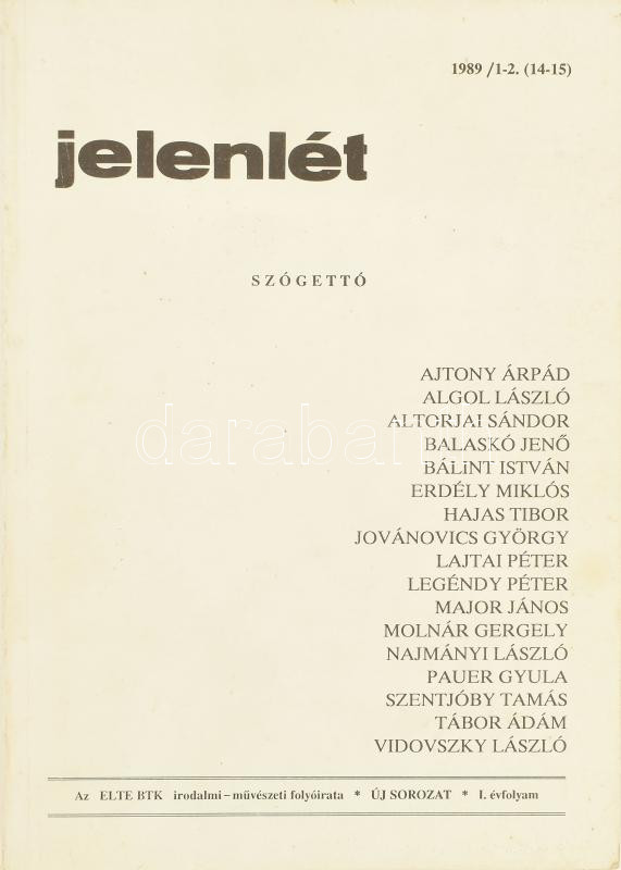 Description: Szógettó. Válogatás az új magyar avantgarde dokumentumaiból. Jelenlét 1989/1-2 szám. Az anyagot gyűjtötte és vál.: Papp Tamás. Szerk.: Császár László, Farkas Gábor, Kukorelly Endre, Sziládi Zoltán. Bp., 1989, ELTE BTK. Kiadói papírkötés.