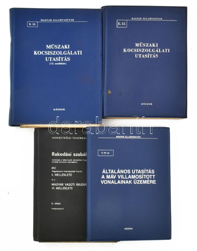 Vegyes vasúti könyvtétel, 4 db: Általános utasítás a MÁV villamosított vonalainak üzemére. Bp., 1991, KÖZDOK. Kiadói nyl-kötés.; Műszaki kocsiszolgálati utasítás. (13. melléklet.) Bp., 1981, KÖZDOK. Kiadói spirálkötés.; Műszaki kocsiszolgálati utasítás. Bp., 1977, KÖZDOK. Kiadói nyl-kötés.; Rakodási szabályok. Szabályzat a teherkocsik nemzetközi forgalomban történő kölcsönös használatára. II. kötet. Vonalosztályok. RIV II. melléklete és a Magyar Vasúti Árudíjszabás I. rész VI. melléklete. hn., 1973., KPM Vasúti Főosztály - KÖZDOK. Kiadói ny-kötés, foltos lapokkal.;