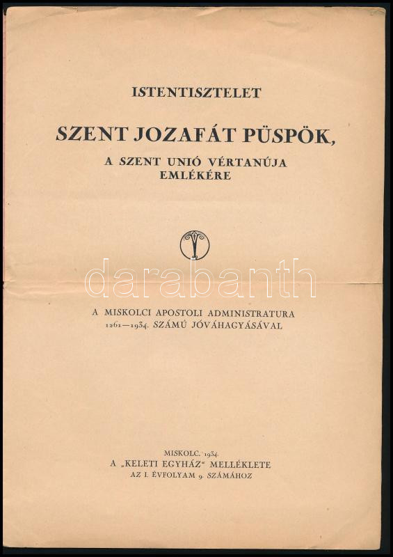 Istentisztelet Szent Jozafát püspök, a Szent unió vértanúja emlékére. A "Keleti Egyház" melléklete az I. évf. 9. számához. Miskolc,1934, k.n. 8 p. Kiadói papÃrkötés, borÃtón Dr. Etter JenÅ‘ (1897-1973) ügyvéd, Esztergom polgármestere bélyegzÅ‘jével és ráragasztott cÃmkével, szakadt borÃtóval, lapok szélén szakadásokkal.