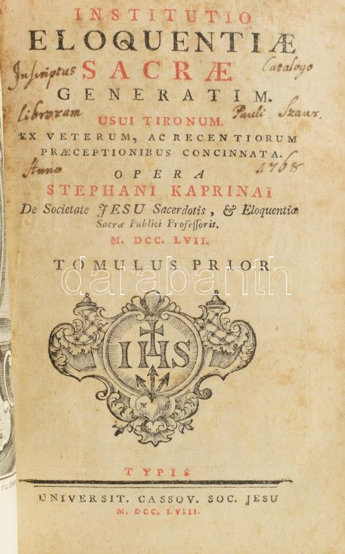 Kaprinai István: Institutio eloquentiae sacrae generatim. usui tironum et veterum, ac recentiorum praceptionibus concinnata. Tomulus Prior. Cassoviae, 1758, Typis Cassoviensibus Soc. Jesu, 1 t.+16+752+14 p. Latin nyelven. Korabeli egészbőr-kötés, kopott borítóval, foltos, kissé sérült gerinccel, foltos lapokkal, az utolsó lapokon kis lyukakkal.