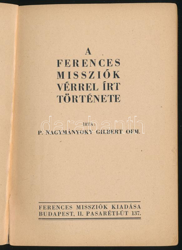 P. Nagymányoky Gilbert Ofm.: A ferences missziók vérrel írt története. Bp., Ferences Missziók. Kiadói papírkötés, gerinc sérült, kopottas állapotban.