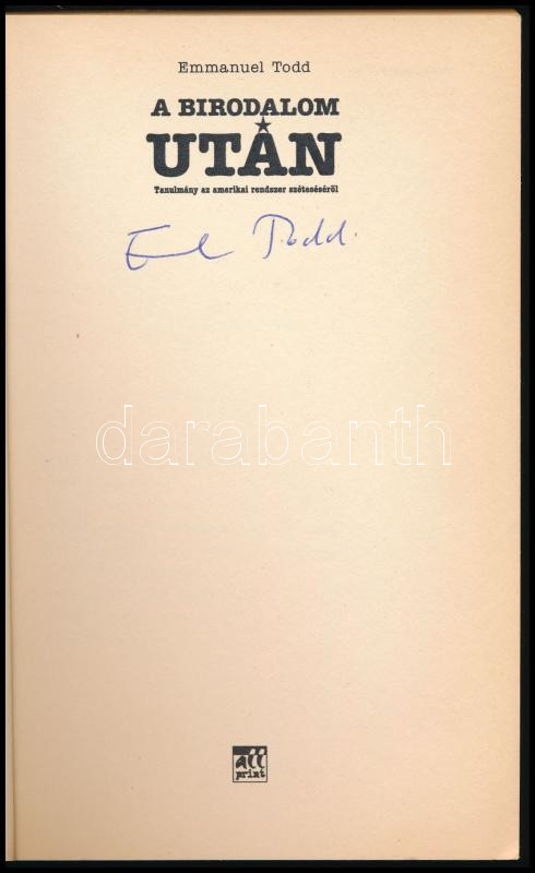 Emmanuel Todd: A birodalom után. Tanulmány az amerikai rendszer szétes... https://www.darabanth.com/en/469-Online-auction/469.0/Books/Books-Social-sciences~1000026/Emmanuel-Todd-A-birodalom-utan-Tanulmany-az-amerikai-rendszer-szeteseserol-Alairt-Bp-~II3147600