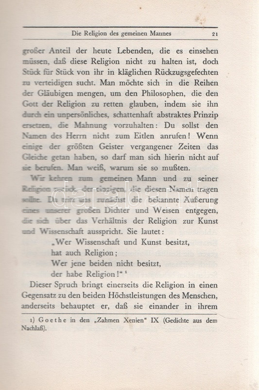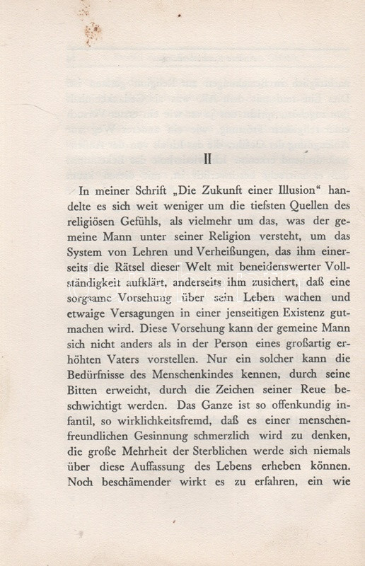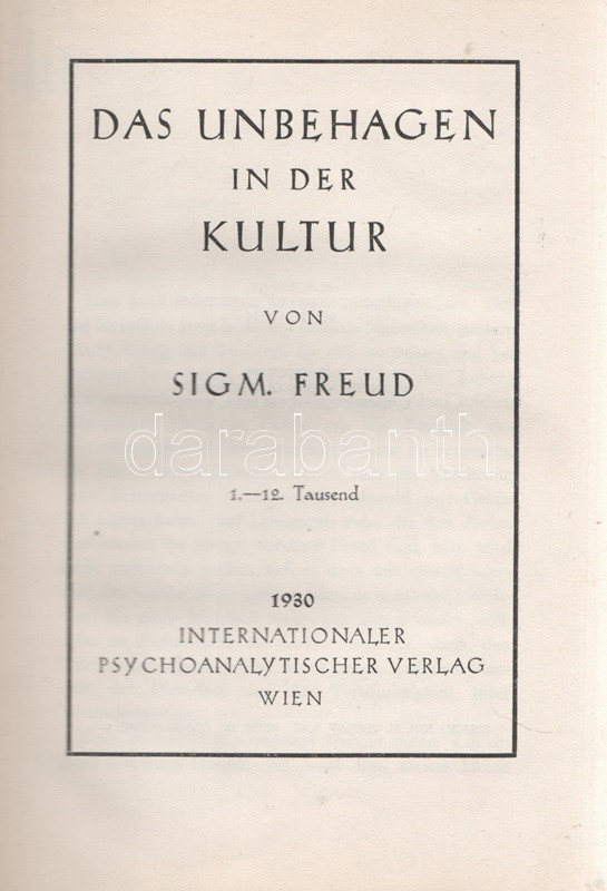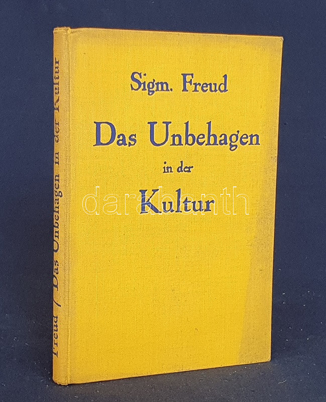 Freud, Sigmund: Das Unbehagen in der Kultur. [Bécs] Wien, 1930. Internationaler Psychoanalytischer Verlag (Druck Von Johann N. Vernay). 136 p. Első kiadás. Sigmund Freud előadása nem kisebb jelenséget, mint a kultúra jelenségét illeszti pszichoanalitikus elmélete csomópontjába. Freud legfontosabb kultúrkritikai műve magyarul a kissé félrevezető ,,Rossz közérzet a kultúrában" névvel jelent meg, holott a dolgozatban a libidó, a szexualitás és az agresszió kultúra általi korlátozásáról van szó, mely szorongást avagy bűntudatot vált ki áldozatában. Feliratozott, enyhén elszíneződött kiadói egészvászon kötésben. Jó példány.