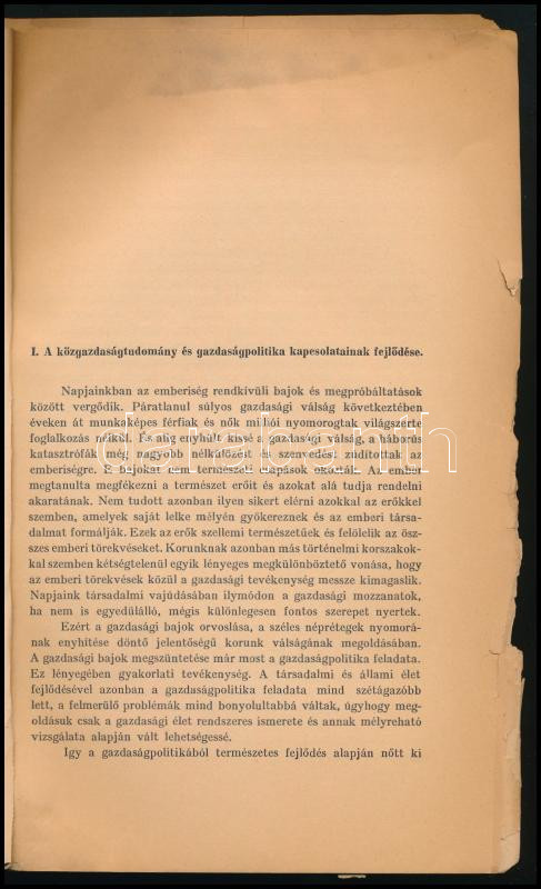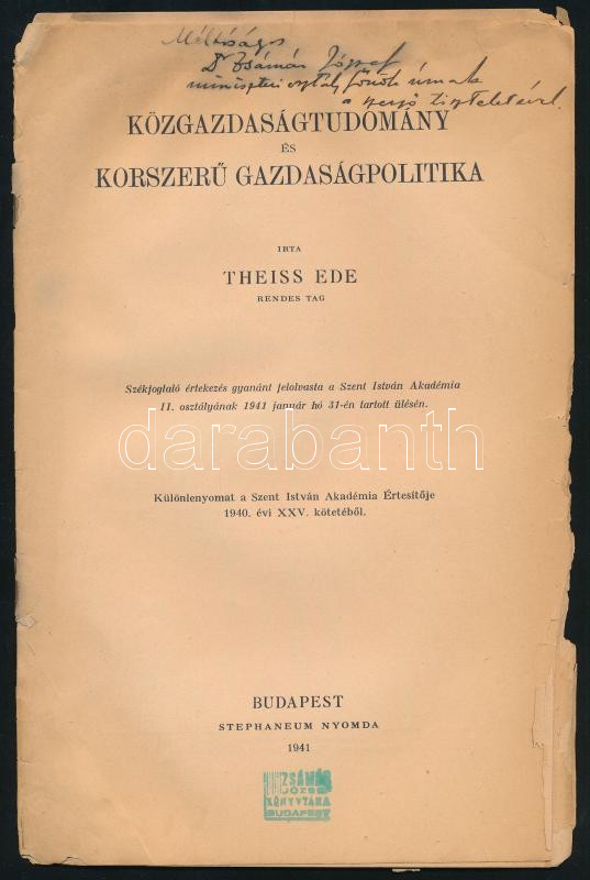 Theiss Ede: Közgazdaságtudomány és korszerű gazdaságpolitika. (Dedikált!) Különlenyomat a Szent István Akadémia Értesítője 1940. évi XXV. kötetéből. Bp., 1941, Stephaneum-ny., 21+(1) p. Kiadói tűzött papírkötés, sérült borítóval és lapszélekkel, kisebb lapszéli ázásnyomokkal. A címlapon a szerző dedikációjával: ,,Méltóságos Dr. Zsámár József miniszteri osztályfőnök úrnak a szerző tiszteletével." Zsámár József ex libris bélyegzőjével.