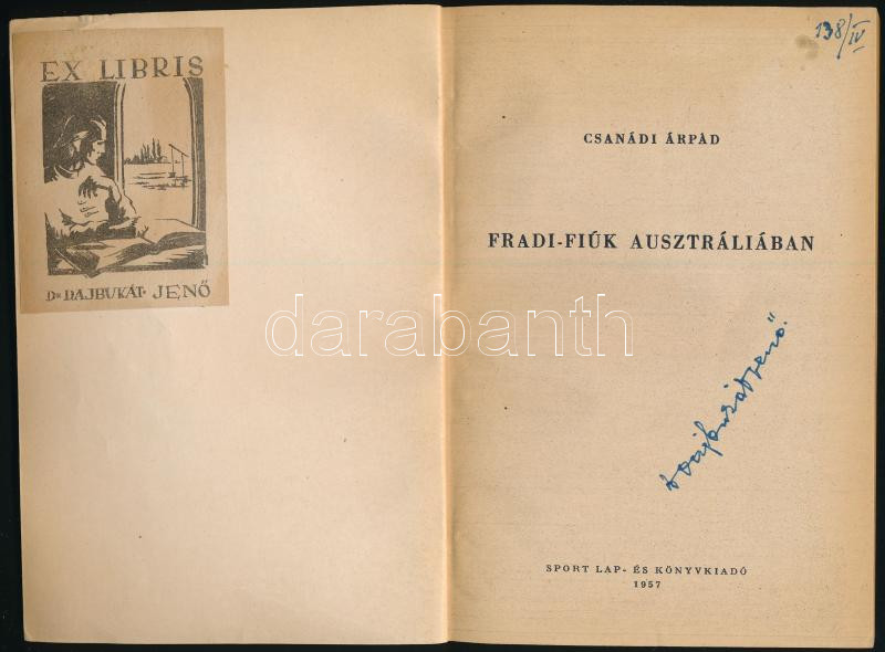 Csanádi Árpád: Fradi-Fiúk Ausztráliában. A borító és zárórajzok illusztrációi Sajdik Ferenc, a térképvázlatok Apródy Jenő munkái. Bp., 1957, Sport. Fekete-fehér fotókkal illusztrálva. Kiadói papírkötés, Dajbukát Jenő ex libris-szével és névbejegyzésével.