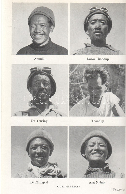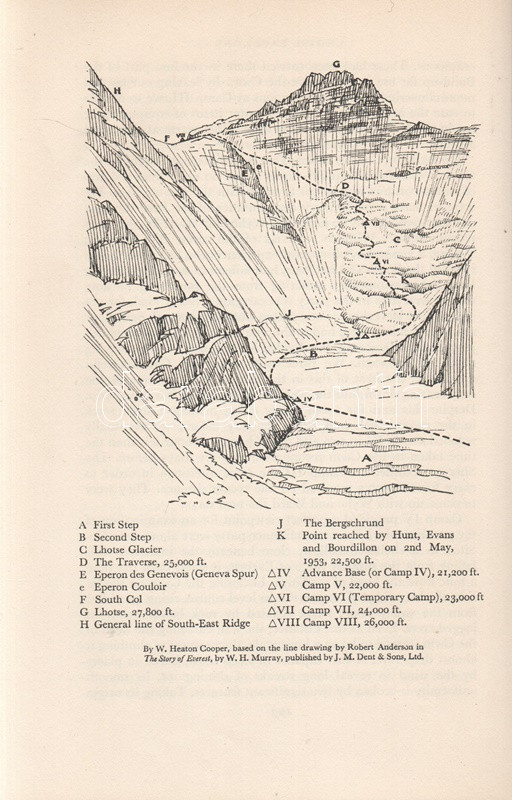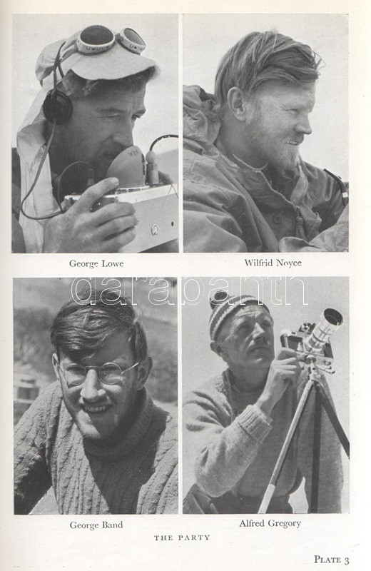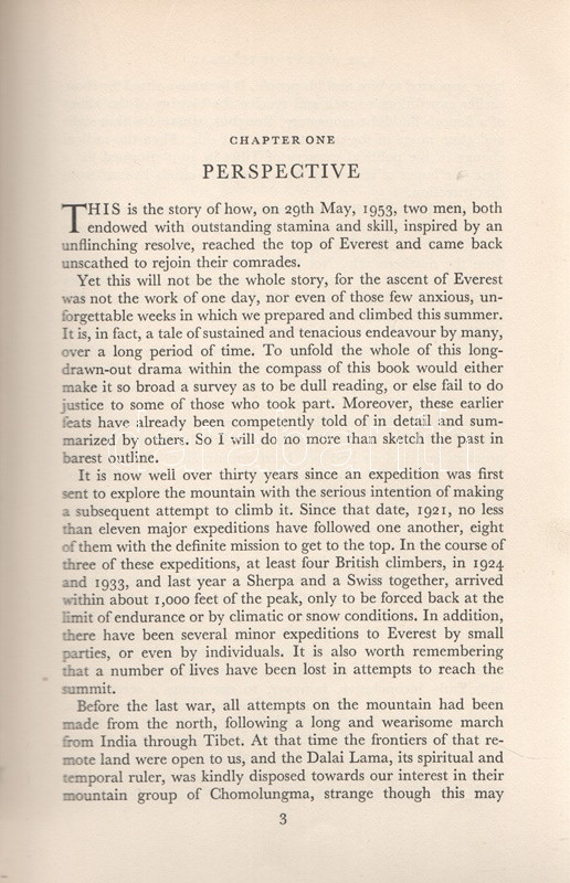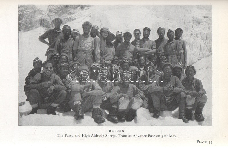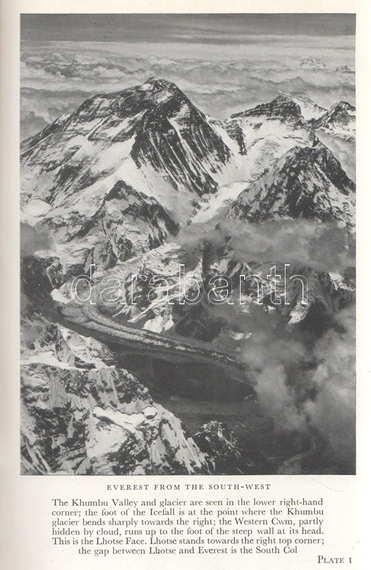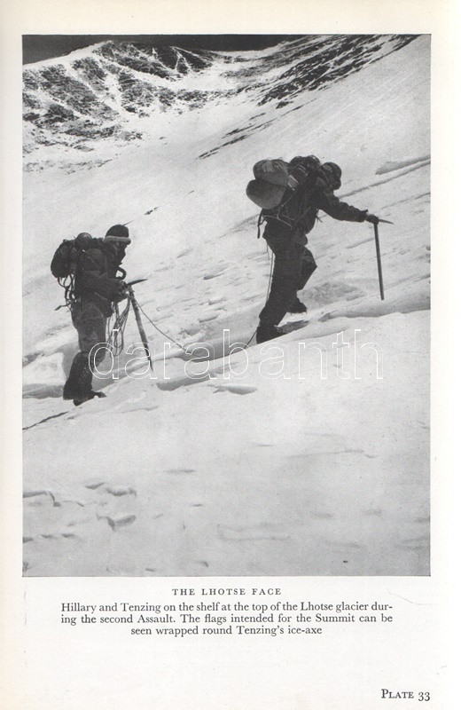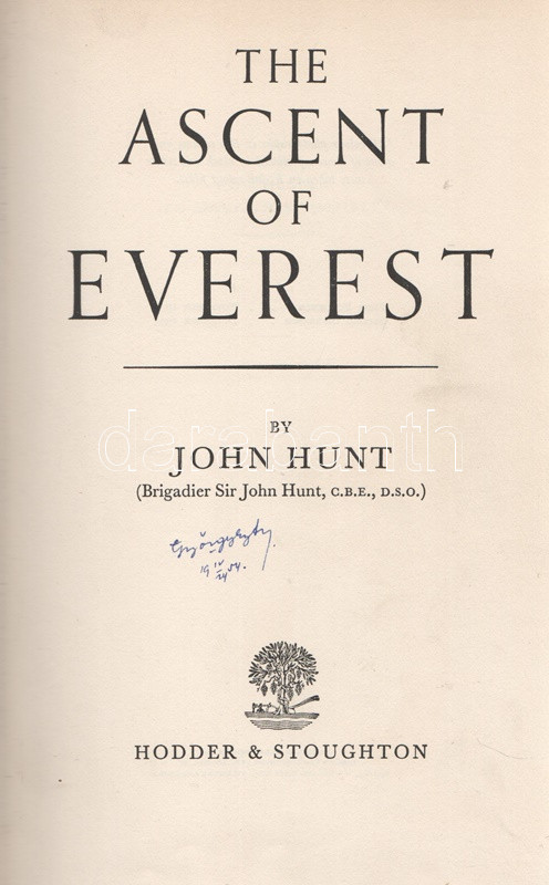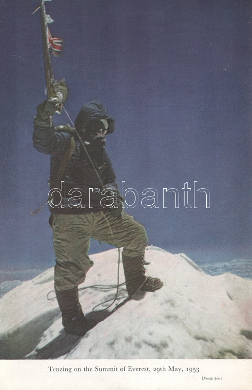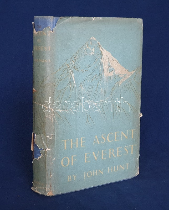 Hunt, John: The Ascent of Everest. Foreword by H. R. H. the Duke of Edinburgh, Chapter 16 by Sir Edmund Hillary, Appendices by Members of the Expedition. (London, 1953). Hodder & Stoughton (Printed by Hazell, Watson and Viney Ltd.) 1 t. (színes címkép) + XX + 299 + [1] p. + 31 t. (7 színes, 24 kétoldalas). A katonai családba születő John Hunt (1910-1998) katonatiszt, hegymászó, a világ legmagasabb hegycsúcsára, a Mount Everestre vezető első, 1953. évi expedíció vezetője. Oldalszámozáson belül térképvázlatokkal, karikatúrákkal, rajzokkal és ábrákkal illusztrált beszámolója a magashegységi túrázás történeti jelentőségű dokumentuma. A kötet első kiadása a sikeres csúcstámadás évében jelent meg, példányunk az azonos évben megjelenő második lenyomatból származik. Aranyozott gerincű kiadói egészvászon kötésben, színes, illusztrált, enyhén sérült eredeti védőborítóban. Jó példány.