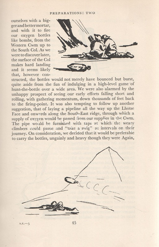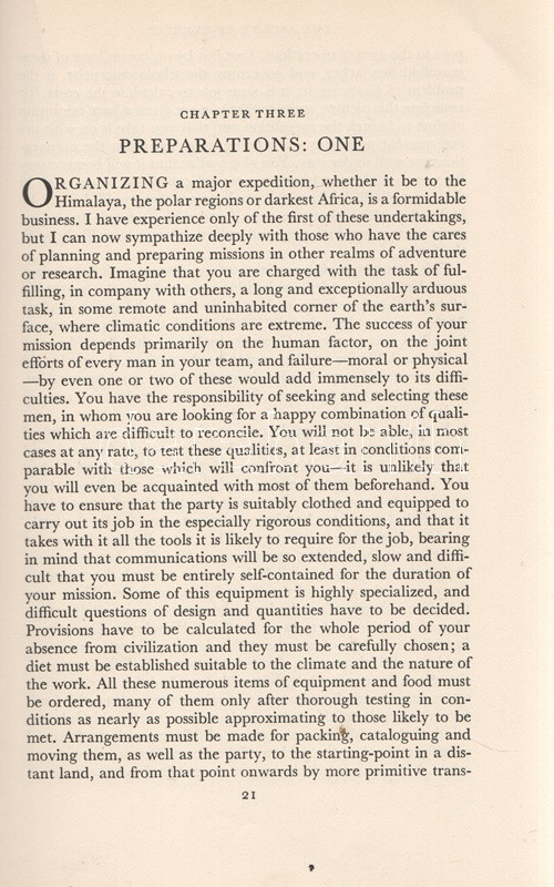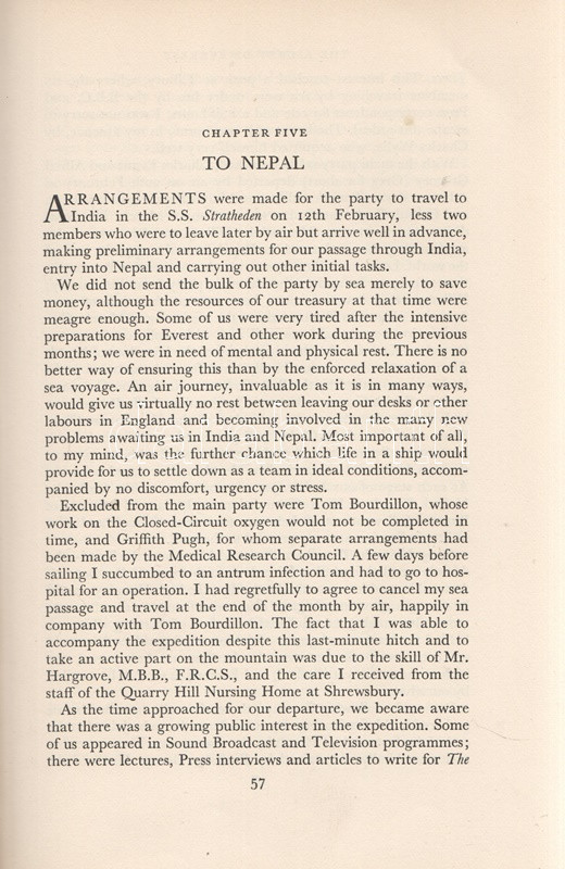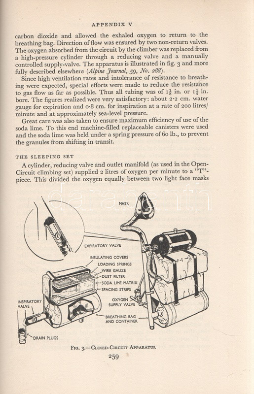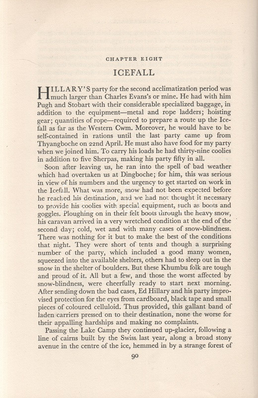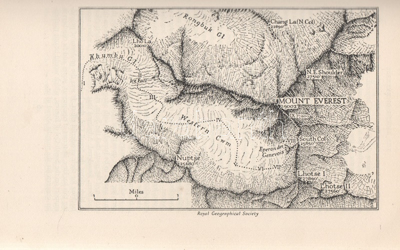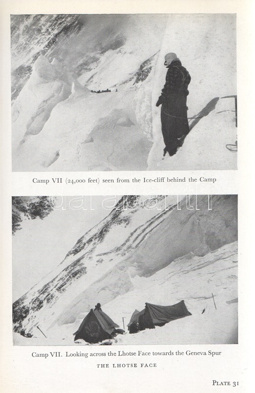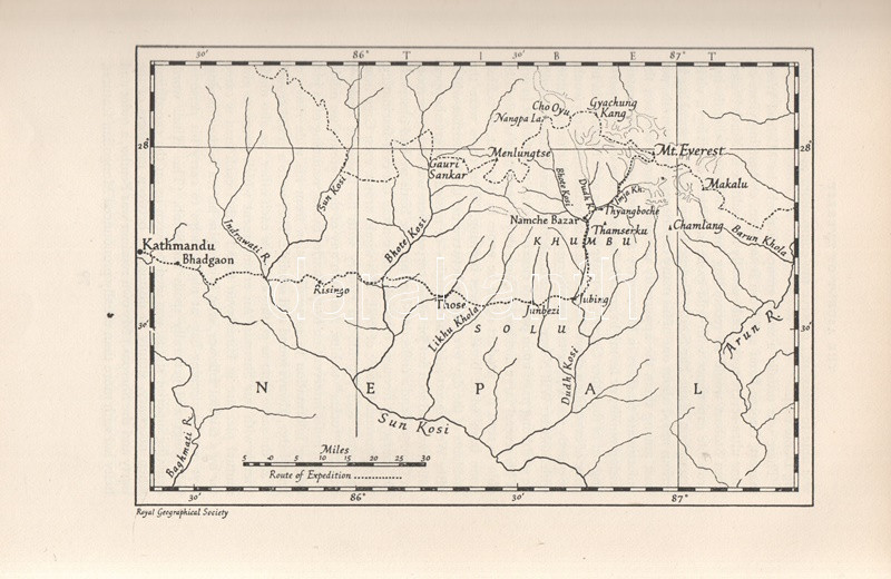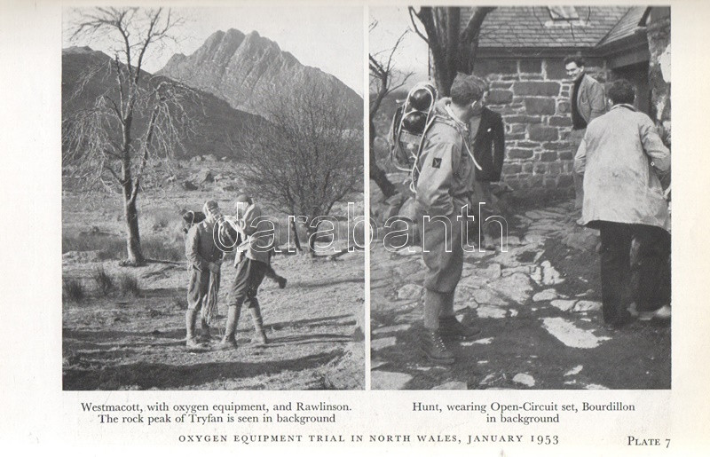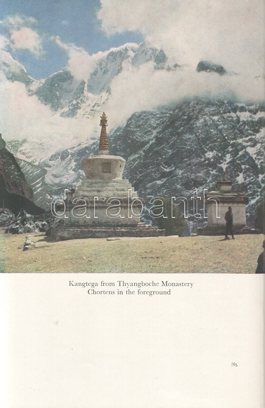 Hunt, John: The Ascent of Everest. Foreword by H. R. H. the Duke of Edinburgh, Chapter 16 by Sir Edmund Hillary, Appendices by Members of the Expedition. (London, 1953). Hodder & Stoughton (Printed by Hazell, Watson and Viney Ltd.) 1 t. (színes címkép) + XX + 299 + [1] p. + 31 t. (7 színes, 24 kétoldalas). A katonai családba születő John Hunt (1910-1998) katonatiszt, hegymászó, a világ legmagasabb hegycsúcsára, a Mount Everestre vezető első, 1953. évi expedíció vezetője. Oldalszámozáson belül térképvázlatokkal, karikatúrákkal, rajzokkal és ábrákkal illusztrált beszámolója a magashegységi túrázás történeti jelentőségű dokumentuma. A kötet első kiadása a sikeres csúcstámadás évében jelent meg, példányunk az azonos évben megjelenő második lenyomatból származik. Aranyozott gerincű kiadói egészvászon kötésben, színes, illusztrált, enyhén sérült eredeti védőborítóban. Jó példány.