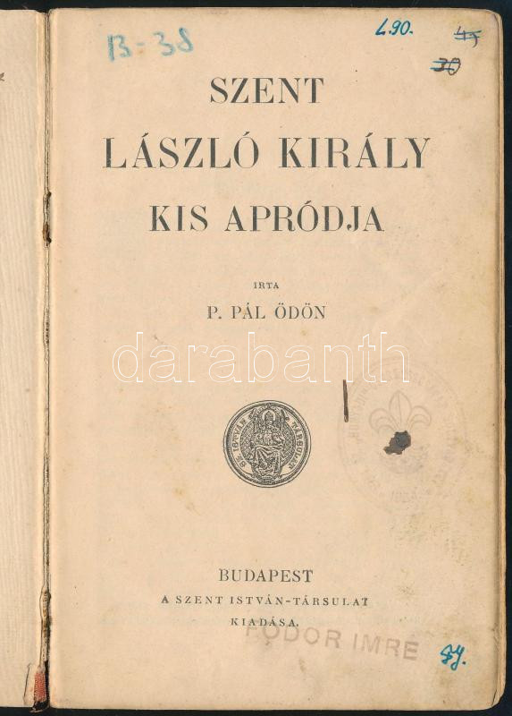 P. Pál Ödön: Szent László király kis apródja. Magyar Ifjúság Könyvtára 1. sz. Bp., 1927, Szent István-Társulat, 36 p. Kiadói félvászon-kötés, kissé viseltes, foltos borítóval, kissé foltos lapokkal, a fűzéstől részben elváló lapokkal. A soltvadkerti 884. sz. ,,Hunyadi" cserkészcsapat tulajdonosi bejegyzésével és bélyegzőjével.