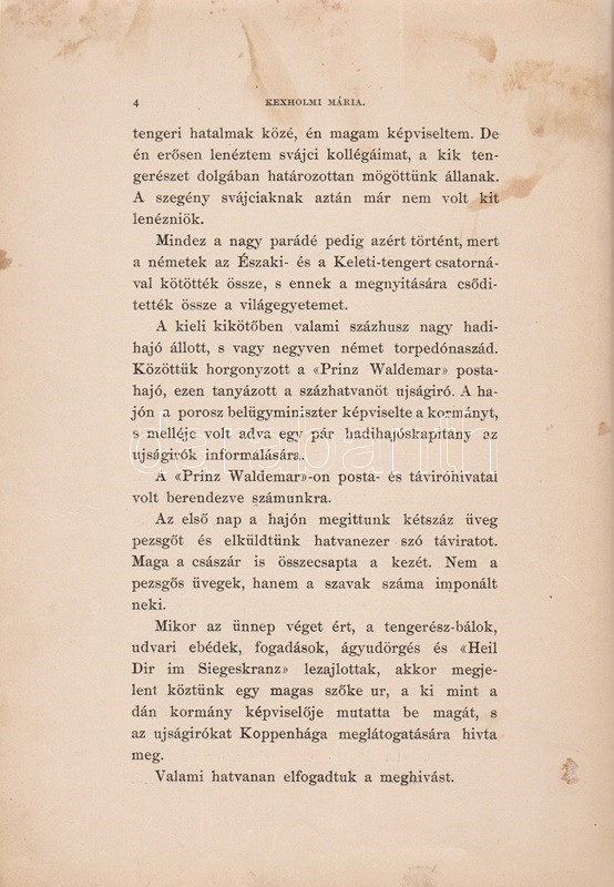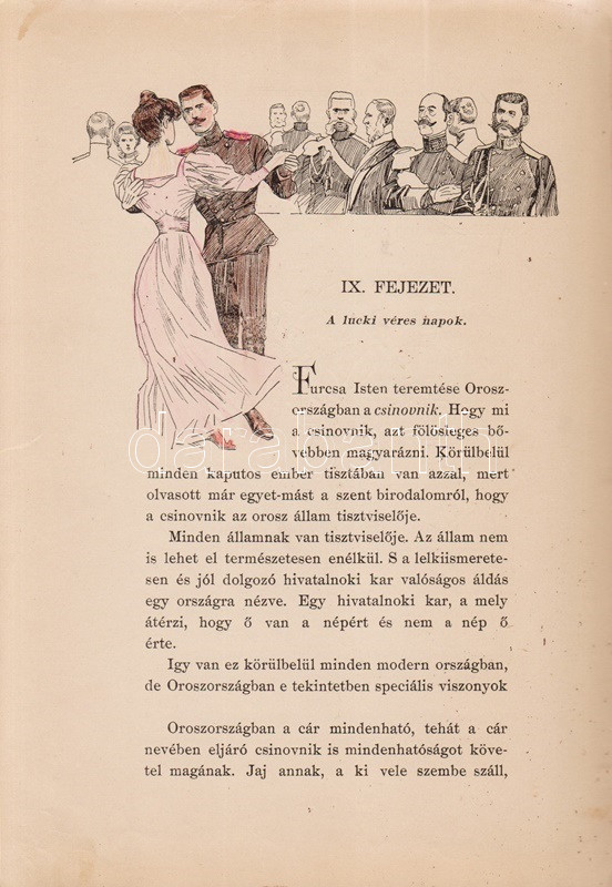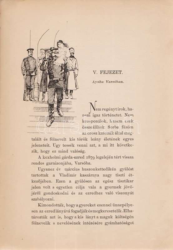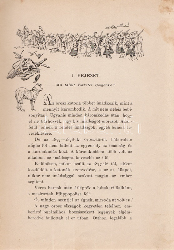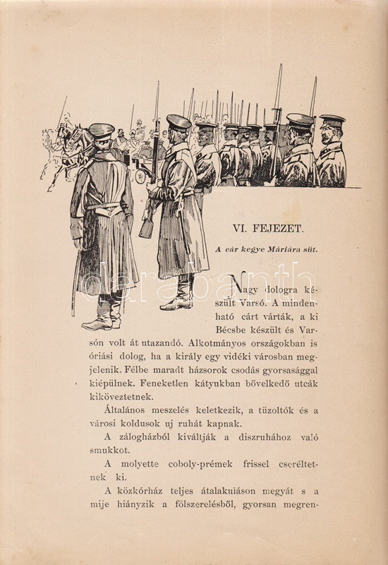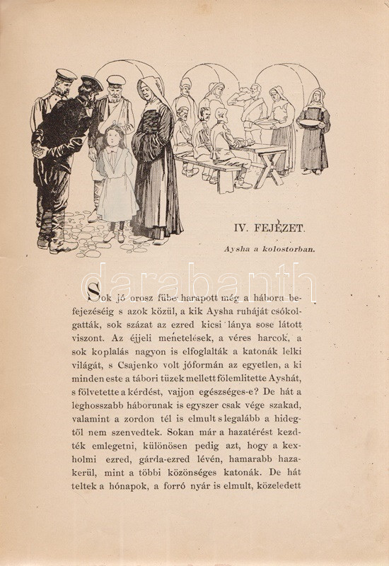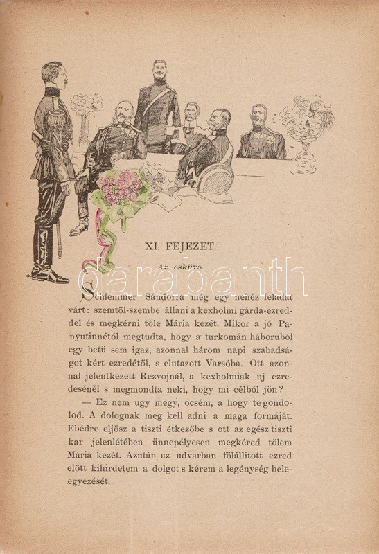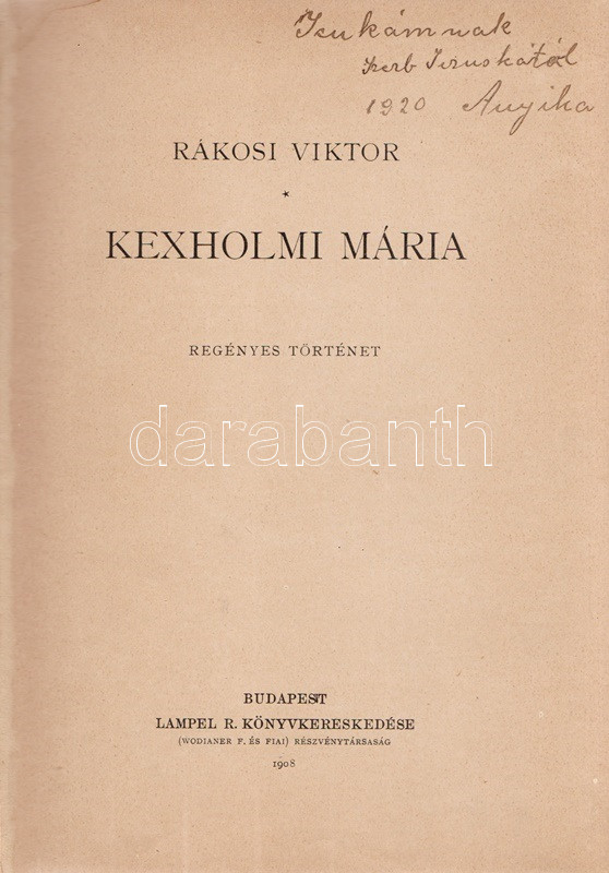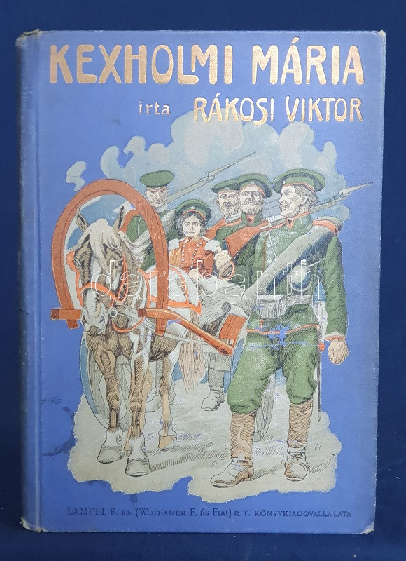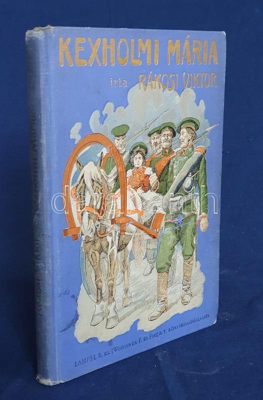 Rákosi Viktor: Kexholmi Mária. Regényes történet. Budapest, 1908. Lampel R. könyvkereskedése - Wodianer F. és Fiai (Frankin-Társulat ny.) 114 + [2] p. Első kiadás. Oldalszámozáson belül szövegközti rajzokkal gazdagon illusztrált regényes történet, mely az orosz hadsereg kexholmi ezredében felnövekedő talált gyermeklány sorsát követi nyomon, megtalálásától esküvőjéig. A bevezető fejezet fikciója szerint az elbeszélt történet egyben bemutatja a cári hadsereg emberséges hétköznapjait. Rákosi Viktor russzofil regénye kuriózumnak számít a korszakban, magyar szerzők orosz témájú elbeszélései gyakran ellenséges birodalomként jelenítik meg a cárságot. A címoldalon régi ajándékozási bejegyzés, az egykori tulajdonos néhány rajzot kézi színezéssel látott el, a kötet első íveinek lapjain felül apró foltosság, néhány levélen apró szakadásnyom. Aranyozott, festett, illusztrált, vaknyomásos, enyhén kopott kiadói egészvászon kötésben. Jó példány.
