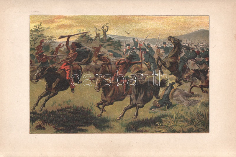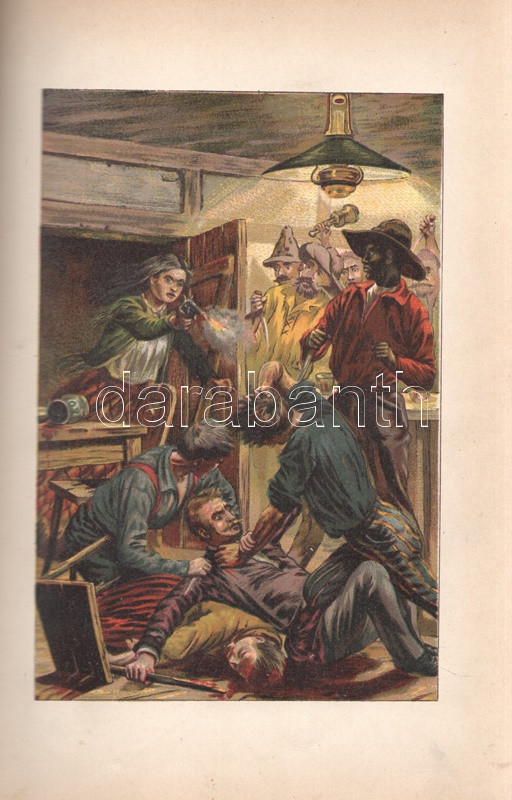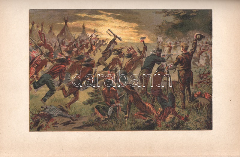 Scipio, Rudolf: Jenseits des Oceans. Erlebnisse in den Prairien und Wildnissen des amerikanischen Westens. Der Jugend erzählt von Rudolf Scipio. Mit 5 Farbendruckbildern von E. Klingebeil. Dritte Auflage. Berlin, (1891). Verlag von Herman J. Meidinger (Druck von C. H. Schulze und Co., Gräfenhainichen). 1 t. (színes kőnyomatú címkép) + [4] + 160 + [2] p. + 4 t. (színes). Rudolf Scipio (1837-1901) német ifjúsági író. Indián és pionír témájú kalandregényei a terjeszkedő Egyesült Államok határvidékein játszódnak. ,,Jenseits des Oceans" (Az Óceán túloldalán) címen megjelent elbeszéléskötete 26 rövid történetet tartalmaz. Példányunk első előzékének fűzése javítva. Színes, festett, illusztrált, aranyozott, vaknyomásos kiadói egészvászon kötésben (Hübel & Benck). Jó példány.