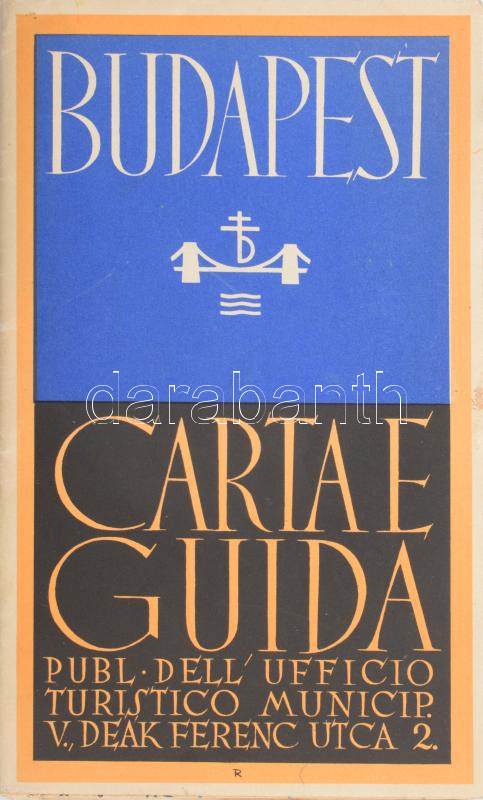 1935 Budapest Carta e Guida. Bp., Ufficio Turistico Municip., kétoldalas olasz nyelvű turista kalauz, fekete-fehér fotókkal, benne nem csak budapesti, hanem magyar információkkal is, valamint Budapest térképpel, térkép: 45x41 cm