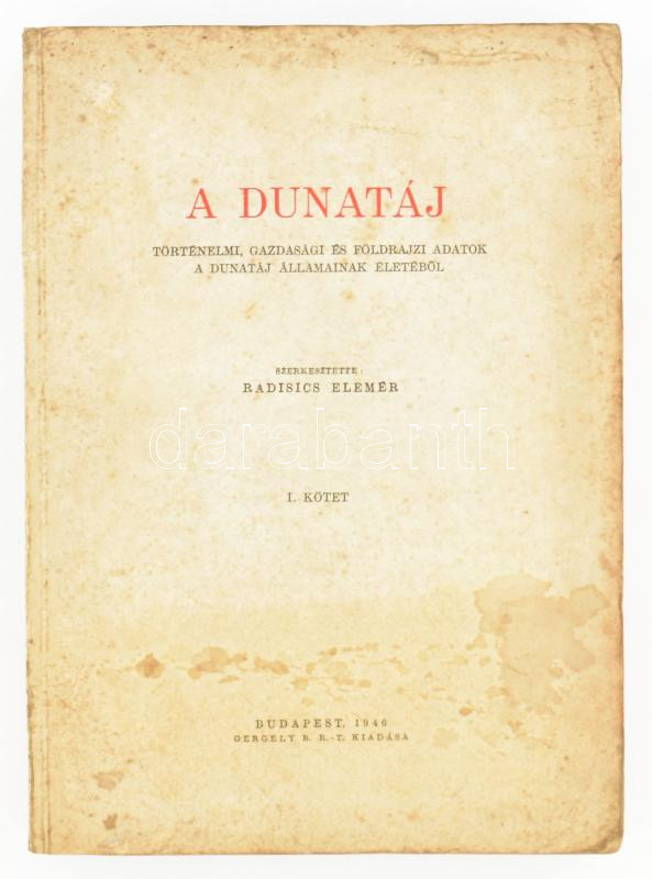 Description: 1946 A Dunatáj. Történelmi, gazdasági és földrajzi adatok. A Dunatáj államainak életéből. I. köt. Szerk.: Radisics Elemér. Bp., 1946, Gergely R. Kiadói papírkötés, foltos.