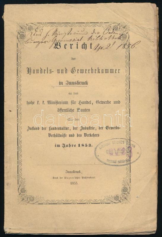 Description: Bericht der Handels- und Gewerbekammer in Innsbruck ... über den Zustand der Landeskultur, der Industrie, der Gewerbs-Verhältnisse und des Verkehrs in Jahre 1853. Innsbruck, 1855 Wagner. 56 p. X t. Kiadói papírborítóval / In paper cover