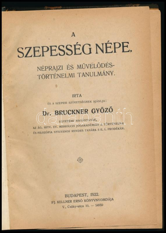 Bruckner Győző: A Szepesség népe. Néprajzi és művelődéstörténelmi tanulmány. Bp., 1922, Ifj. Kellner Ernő-ny., 84 p. Hozzákötve: [Lám Frigyes] Friedrich Lám: Zipser Treue. Gedichte, dem Zipser Bund gewidmet von - -. Bp., [1921], Zipser Bund, 63+1 p. Német nyelven. Hozzákötve: [Haberern Jonathán]: Jonathan Haberern: Natur- und Lebensbilder aus der Zips. Dritte, vollständige Ausgabe, besorgt von Johann Loisch. Mit einem Anhang hrsg. vom Zipser Verein in Budapest. Bp., 1926, Ludig Kókai, 1 (címkép) t. +94+1 p.+1 t.+1 (Die Oberzips, térkép) t. Német nyelven. Átkötött aranyozott gerincű félvászon-kötés, a gerincen "Zipser: Bücher" felirattal, az elülső táblán magyar nyelvű tartalomjegyzéket tartalmazó címkével, kopott borítóval.
