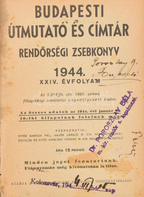 Budapesti útmutató és címtár. Rendőrségi zsebkönyv 1944. XXIV. évf. Szerk.: Barcza Pál, Hajós László, Komlósy Ferenc. Bp., 1944, Pallas, 464 p. Kiadói félvászon-kötés, kissé viseltes állapotban, helyenként kissé foltos, sérült lapokkal, a 407-426. oldalak hiányoznak. Dr. Poroszlay Béla m. kir. rendőrfogalmazó névbejegyzésével és bélyegzőjével.