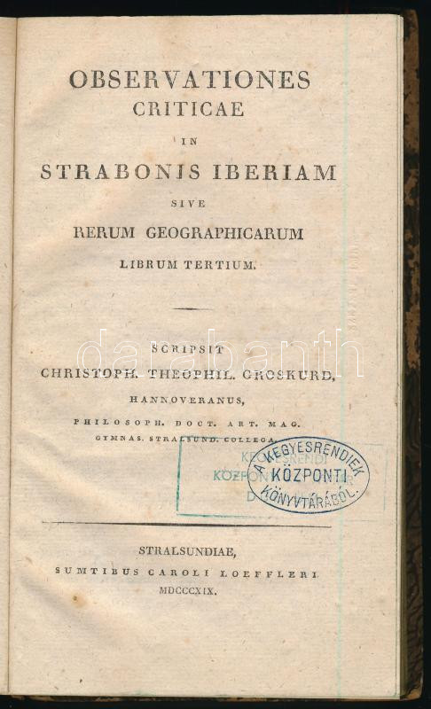 Description: Christoph Theophil. Groskurd: Observationes criticae in Strabonis Iberiam sive Rerum geographicarum, librum tertium. Stralsundiae, 1819, Caroli Loeffleri, XIV+263+3 p. Latin nyelven. Korabeli kartonált papírkötés, kopott borítóval, kissé sérült gerinccel, régi könyvtári bélyegzéssel és címkével.
