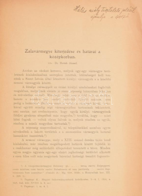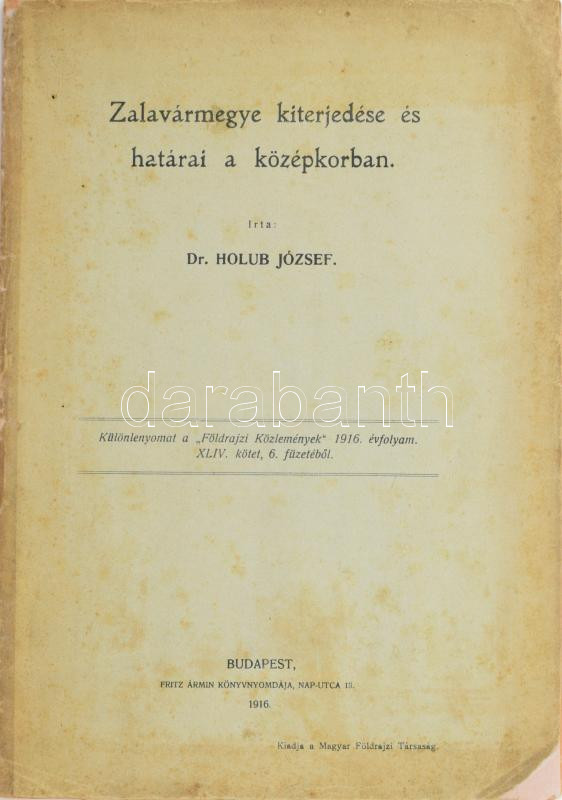 Dr. Holub József: Zalavármegye kiterjedése és határai a középkorban. Különlenyomat a "Földrajzi Közlemények" 1916. évfolyam XLIV. kötet 6. füzetéből. DEDIKÁLT! Bp., 1916, Friz Ármin. Kiadói papírkötés, viseltes állapotban.