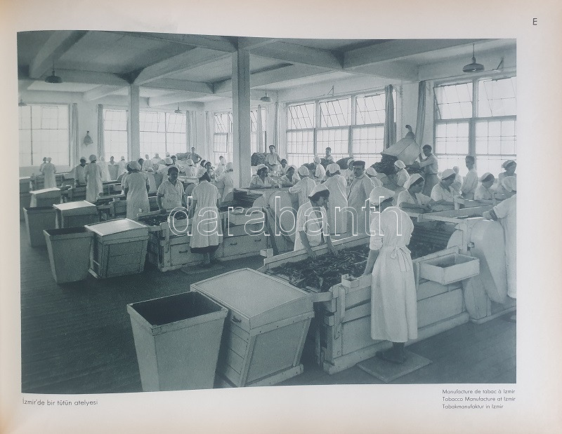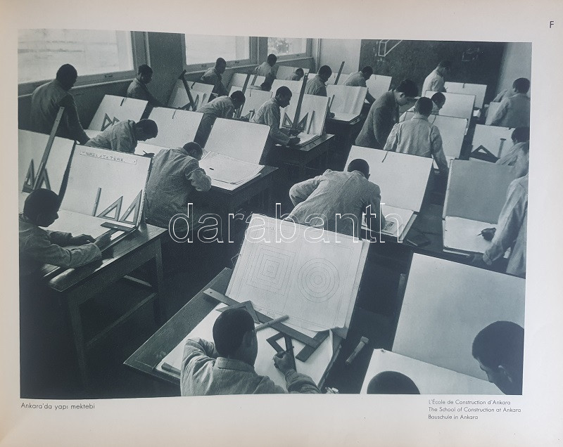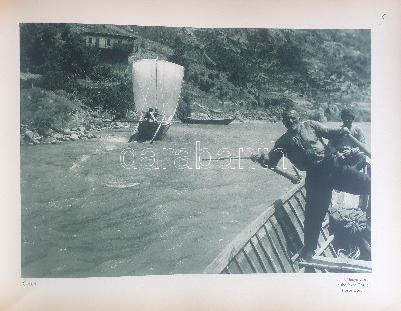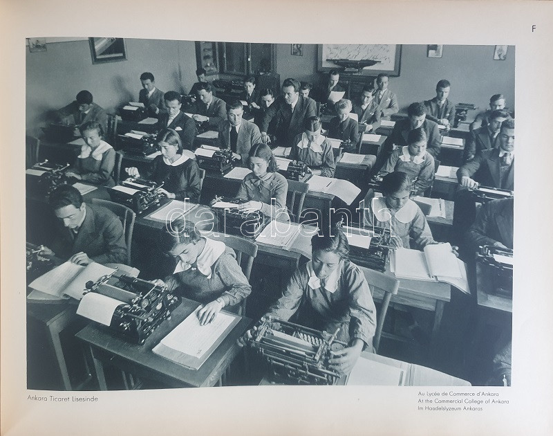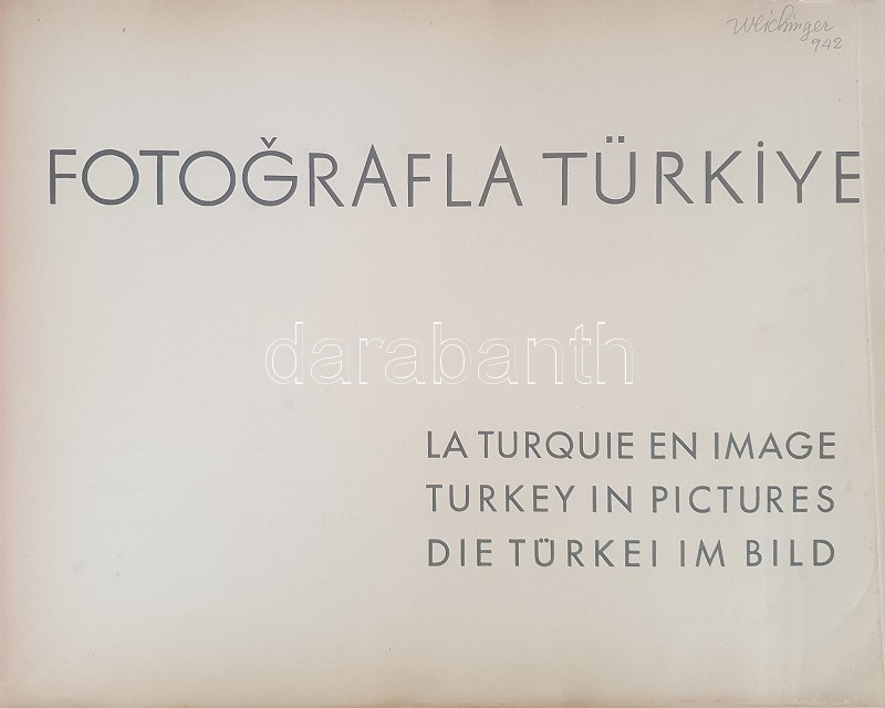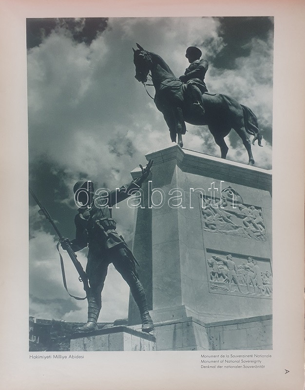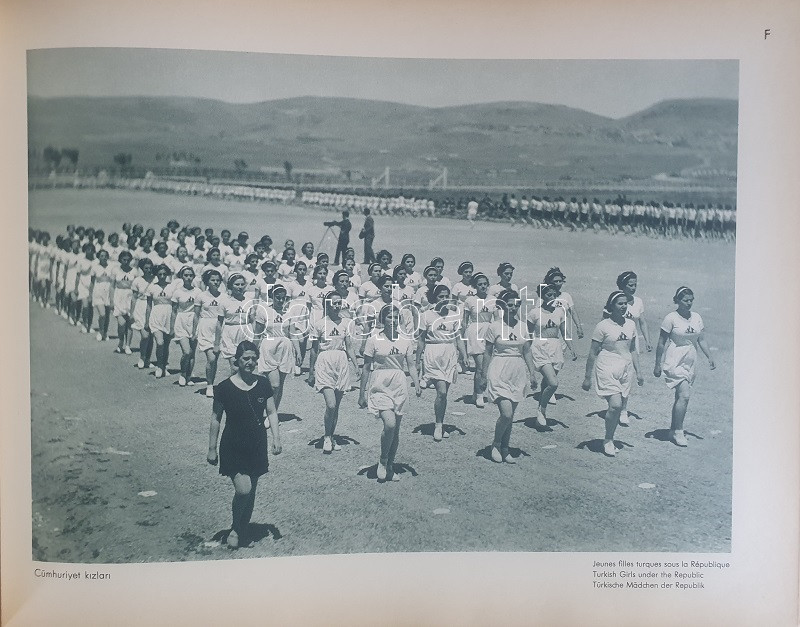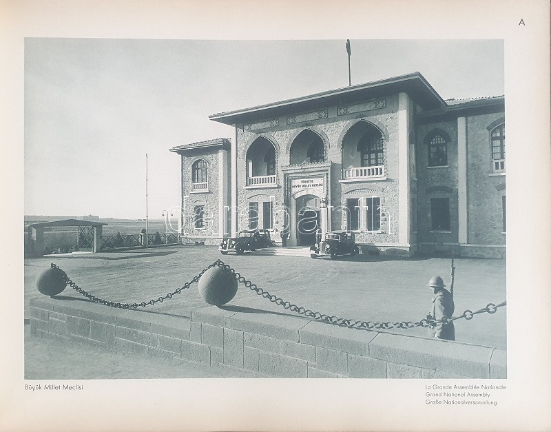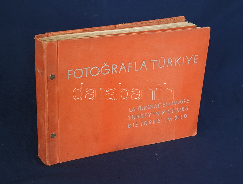 Fotografla Türkiye. La Turquie en image. Turkey in Pictures. Die Türkei im Bild. [Törökország fotóalbuma, fényképezte Othmar Pferschy.] (Ankara), [1936 körül]. (Matbaut Umum Müdürlügü -Druck bei Kunstanstalten F. Bruckmann, München). [20] p. + 154 t. (törökországi enteriőrök, látképek és életképek). Harántfolio. Egyetlen kiadás. A modern Törökország építészetét, kulturális és gazdasági erejét, valamint természeti kincseit bemutató album a török Központi Sajtóiroda megbízásából készült. Az atatürki reformmal kialakult világi Törökország hagyományait, fejlődését, modernségét és életrevalóságát bemutató album fotóanyagának elkészítésére a törökországi témákra szakosodott osztrák fényképészt, Othmar Pferschy (1898-1984) fotóművészt kérték fel. A hat nagy tematikus egységből álló album külön fejezeteket nyit 1. az ország megdöbbentően modernista fővárosának, a Bauhaus-épületek sorával jellemezhető Ankarának - 2. a hagyományos fővárosnak, Isztambulnak - 3. a török vidéknek és természeti kincseinek - 4. az ország régészeti, építészeti és művészeti örökségének - 5. A szerkesztők a legjelentősebb fejezetet a török ipar, közlekedés és mezőgazdaság témájának szentelték - 6. Az album a modern, világi török civilizáció folytatódásának letéteményeseiről, a mindkét nembeli sportoló és tanuló ifjúságról készített fotódokumentációval zárul. A fotóanyag fejezetei között színes határolólapok. A fotódokumentáció előtt a modern török civilizáció török, francia, angol és német nyelvű ismertetése. Az egykori tulajdonos a kötetben elhelyezett egy színes akvarellrajzot, illetve négy archív fotót az épülőfélben levő, egyelőre igen gyéren lakottnak tűnő Ankaráról. Feliratozott kiadói egészvászon kötésben. Jó példány.