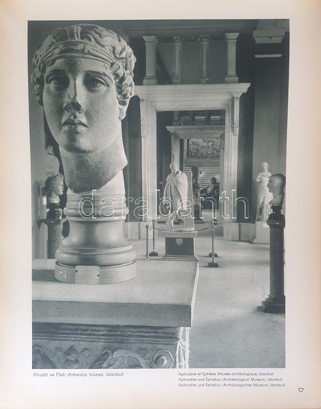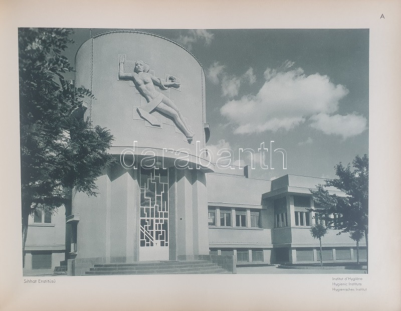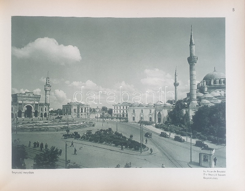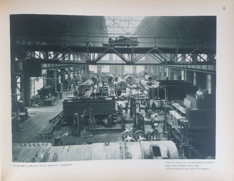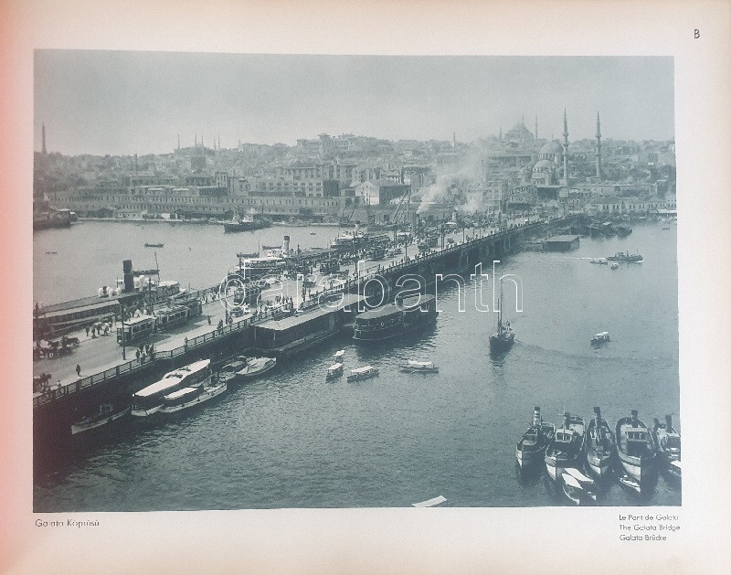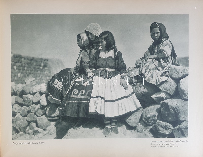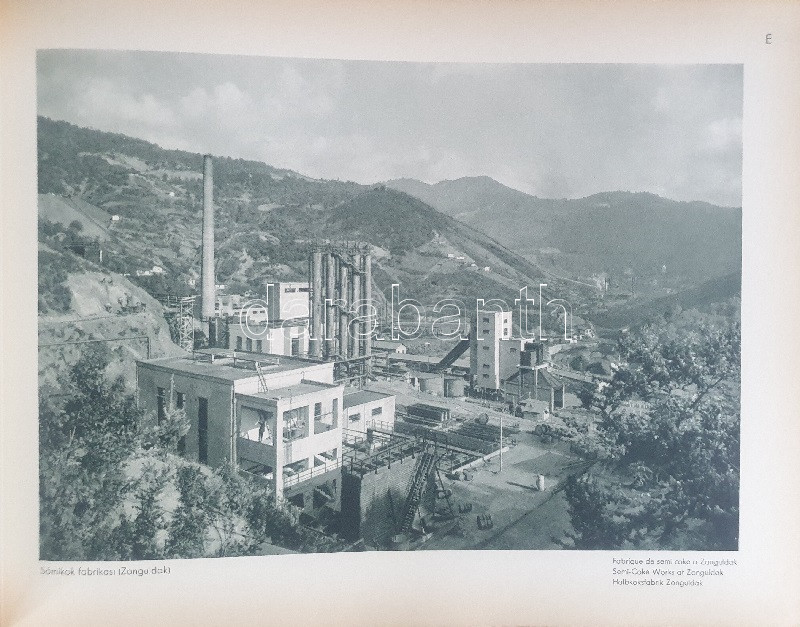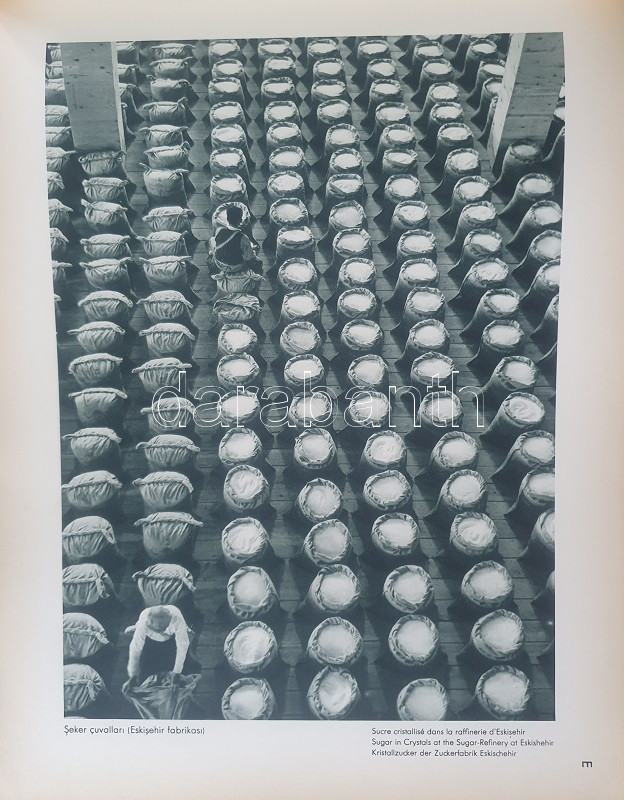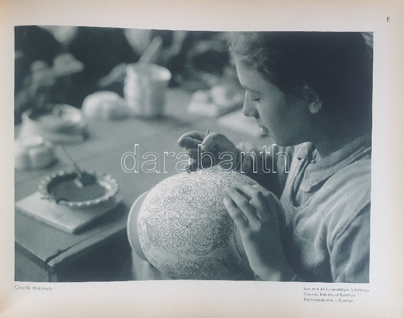 Fotografla Türkiye. La Turquie en image. Turkey in Pictures. Die Türkei im Bild. [Törökország fotóalbuma, fényképezte Othmar Pferschy.] (Ankara), [1936 körül]. (Matbaut Umum Müdürlügü -Druck bei Kunstanstalten F. Bruckmann, München). [20] p. + 154 t. (törökországi enteriőrök, látképek és életképek). Harántfolio. Egyetlen kiadás. A modern Törökország építészetét, kulturális és gazdasági erejét, valamint természeti kincseit bemutató album a török Központi Sajtóiroda megbízásából készült. Az atatürki reformmal kialakult világi Törökország hagyományait, fejlődését, modernségét és életrevalóságát bemutató album fotóanyagának elkészítésére a törökországi témákra szakosodott osztrák fényképészt, Othmar Pferschy (1898-1984) fotóművészt kérték fel. A hat nagy tematikus egységből álló album külön fejezeteket nyit 1. az ország megdöbbentően modernista fővárosának, a Bauhaus-épületek sorával jellemezhető Ankarának - 2. a hagyományos fővárosnak, Isztambulnak - 3. a török vidéknek és természeti kincseinek - 4. az ország régészeti, építészeti és művészeti örökségének - 5. A szerkesztők a legjelentősebb fejezetet a török ipar, közlekedés és mezőgazdaság témájának szentelték - 6. Az album a modern, világi török civilizáció folytatódásának letéteményeseiről, a mindkét nembeli sportoló és tanuló ifjúságról készített fotódokumentációval zárul. A fotóanyag fejezetei között színes határolólapok. A fotódokumentáció előtt a modern török civilizáció török, francia, angol és német nyelvű ismertetése. Az egykori tulajdonos a kötetben elhelyezett egy színes akvarellrajzot, illetve négy archív fotót az épülőfélben levő, egyelőre igen gyéren lakottnak tűnő Ankaráról. Feliratozott kiadói egészvászon kötésben. Jó példány.