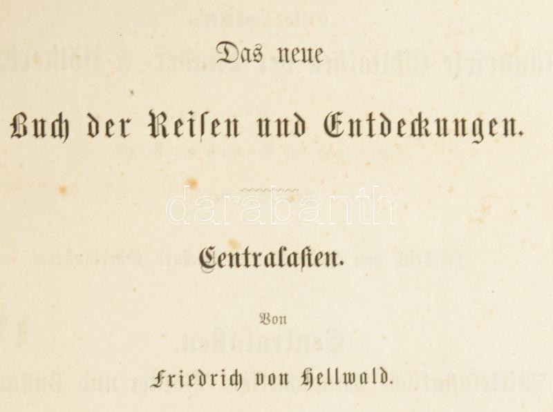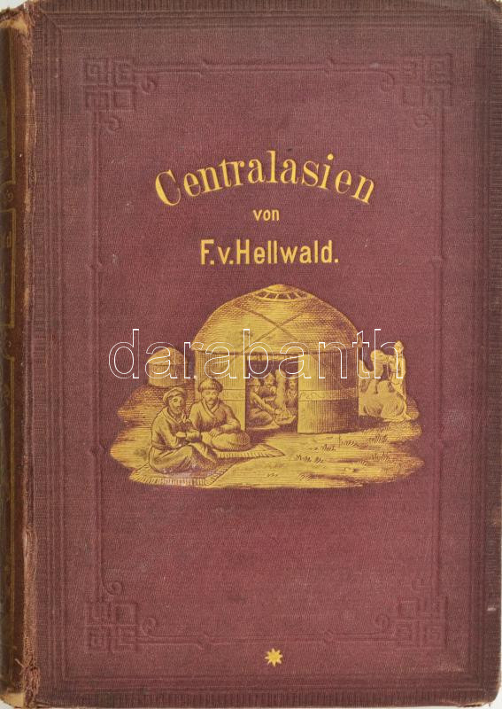 Hellwald, Friedrich von (1842-1892): Centralasien. Landschaften und Völker in Kaschgar, Turkestan, Kaschmir und Tibet. Leipzig, 1875, Otto Spamer, 1 (címkép) t.+ VIII+446+(2) p.+ 1 (kihajtható térkép) t. Első kiadás. Szövegközti és egészoldalas, fekete-fehér illusztrációkkal, térképekkel. Német nyelven. Kiadói aranyozott egészvászon-kötés, kissé sérült borítóval, sérült gerinccel, helyenként kissé foltos lapokkal.