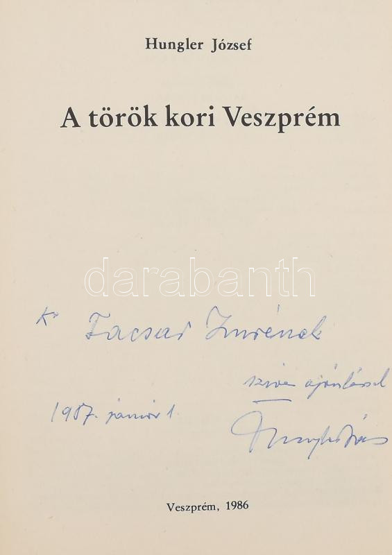 Hungler József: A török kori Veszprém. DEDIKÁLT! Veszprém, 1986, Veszprém Megyei Levéltár. Kiadói kartonált kötés, jó állapotban.