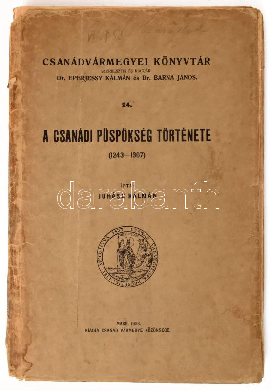 Juhász Kálmán: A Csanádi püspökség története 1243-1307./ Csanádvármegyei Könyvtár/ Makó, 1933. Csanád vármegye közönsége. VIII + 152p. (2) 9 t .; Kiadói papírkötésben szétvált fűzéssel