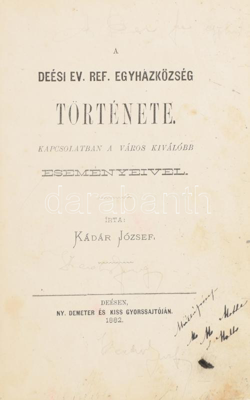 Kádár József: A deési ev. ref. egyházközség története. Kapcsolatban a város kiválóbb eseményeivel. Írta --. Deés (Dés), 1882. Demeter és Kiss. [4] +240 a 251 ből p. Fűzve, kiadói papírborítékban. Hiányos, az utolsó 14 oldal hiányzik. Sérült korabeli vászonkötésben. Szétvált. Nagyon ritka!
